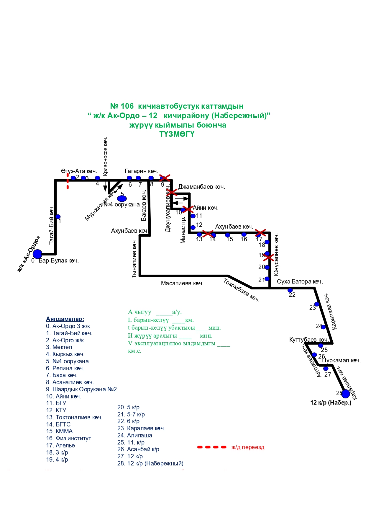 - № 106 — жилмассив «Ак-Ордо» по схеме до улицы Бакаева, далее по улицам Ахунбаева, Тыналиева, Масалиева, Токомбаева, Сухэ-Батора, Каралаева и далее по схеме в 12-й микрорайон (Набережная);