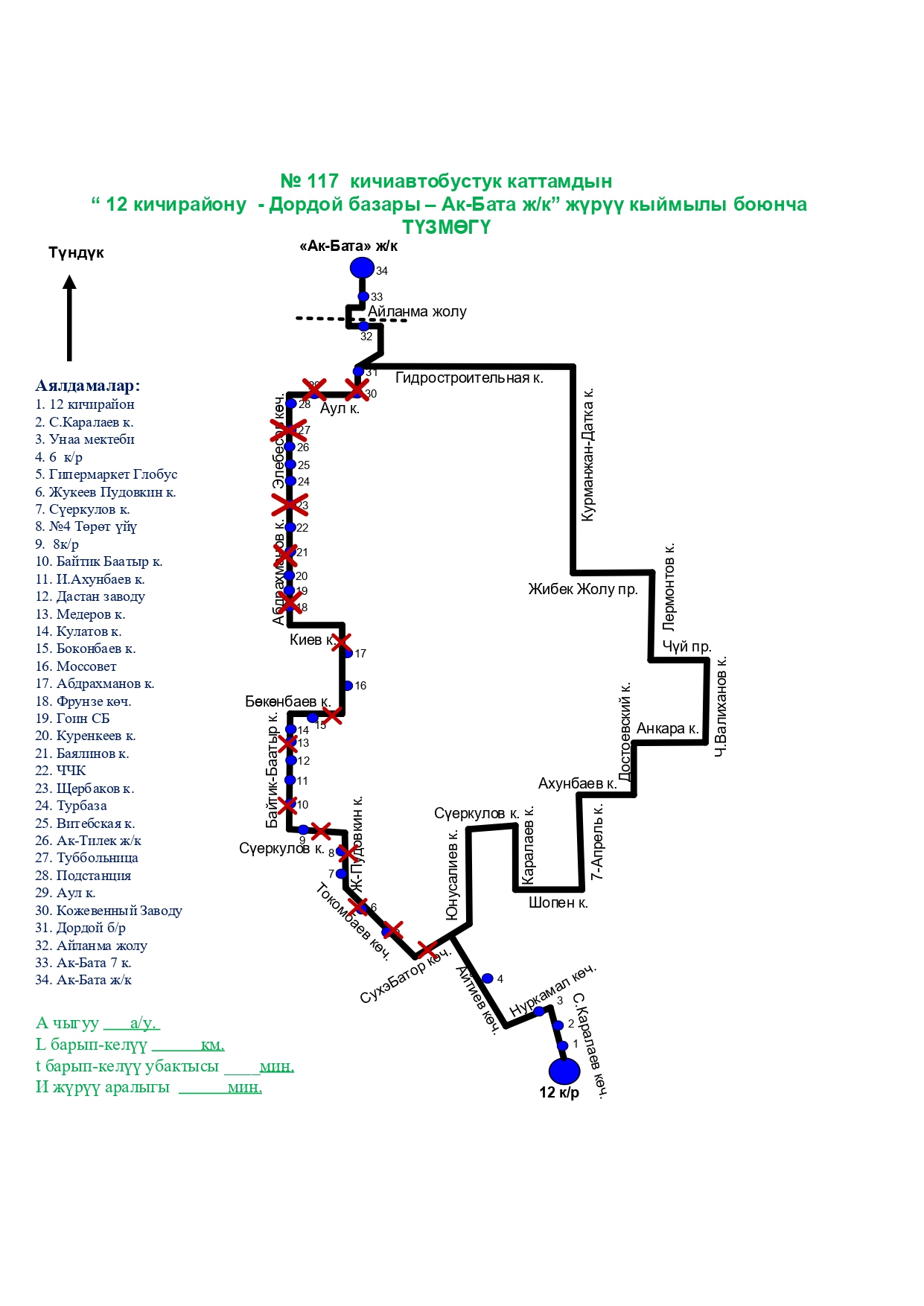 - № 117 — жилмассив «Ак-Бата», улицы Гидростроитель, Курманджан Датки, проспект Жибек Жолу, улица Лермонтова, проспект Чуй, улицы Валиханова, Анкара, Достоевского, Ахунбаева, 7 Апреля, Шопена, Каралаева, Суеркулова, Юнусалиева, до 12-го микрорайона (Набережная);