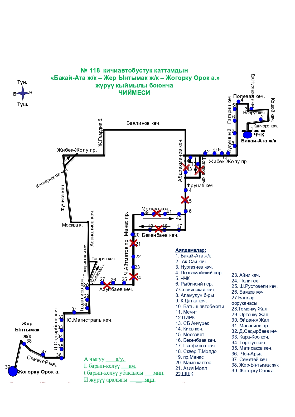 - № 118 — жилмассив «Бакай-Ата» по схеме движения до улицы Абдрахманова, улица Баялинова, бульвар Молодой Гвардии, проспект Жибек Жолу, улицы Фучика, Московская, Поваринская и далее по схеме до села Верхний Орок;