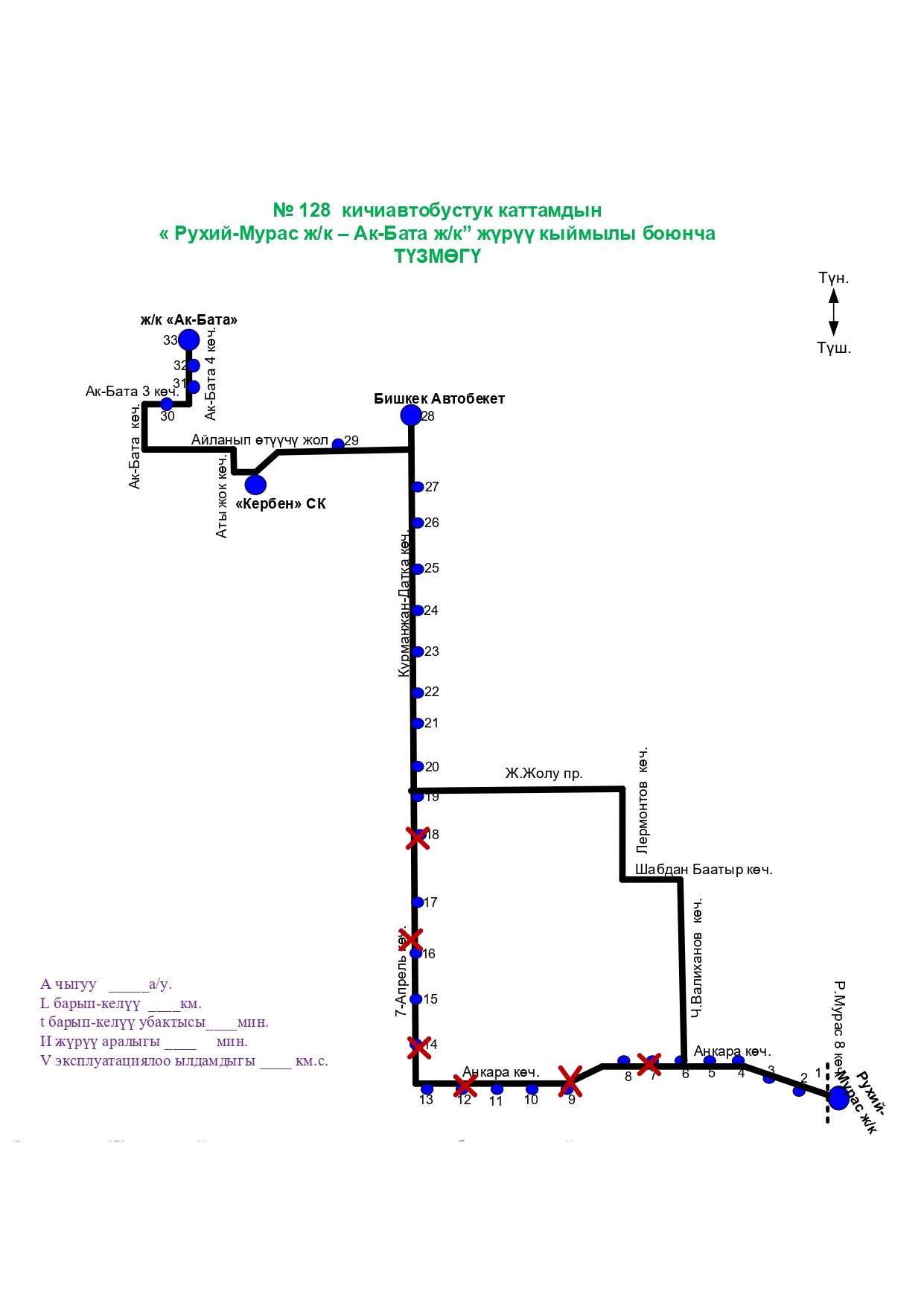 - № 128 — жилмассив «Ак-Бата» по схеме до проспекта Жибек Жолу, улицы Ауэзова, Шабдана Баатыра, Валиханова до улицы Анкара и далее по схеме до жилмассива «Салкын-Тор»;