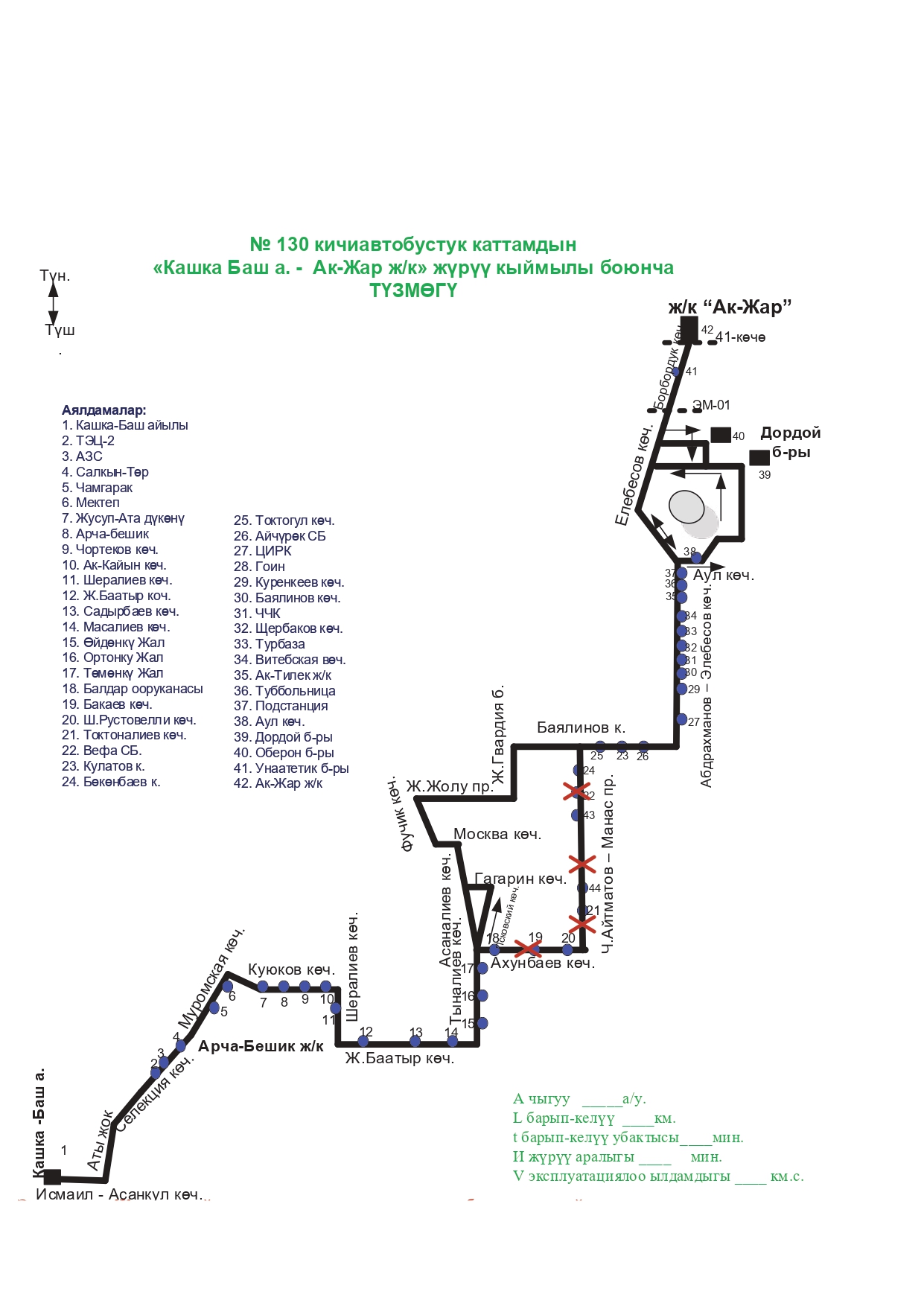 - № 130 — жилмассив «Ак-Жар» по схеме движения до бульвара Молодой Гвардии, проспект Жибек Жолу, улицы Фучика, Асаналиева, Тыналиева, Жайыла Баатыра и далее по схеме жилмассива «Кашка-Баш»;