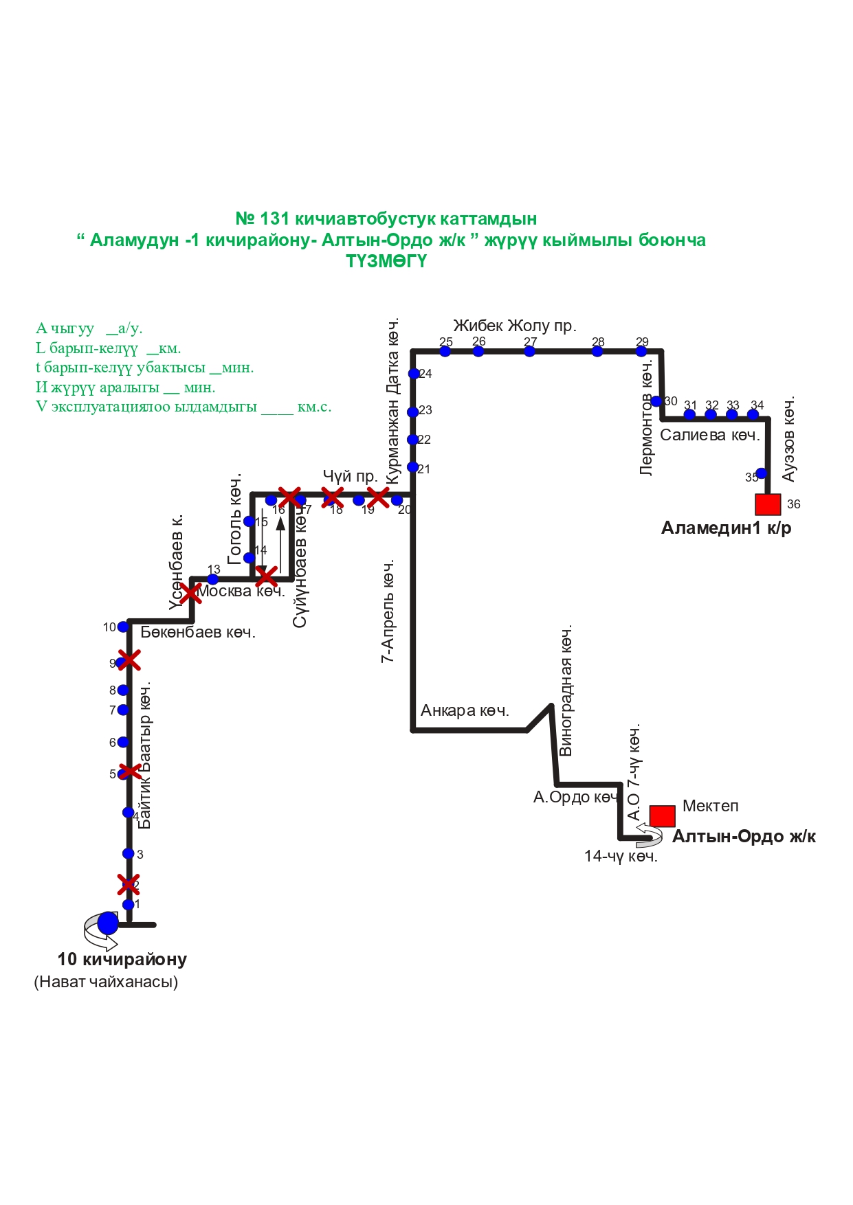 - № 131 — микрорайон «Аламедин-1», по схеме до улицы Курманджан Датки, улицы 7 Апреля, Анкара, Виноградная, Алтын-Ордо, до жилмассива «Алтын-Ордо»;