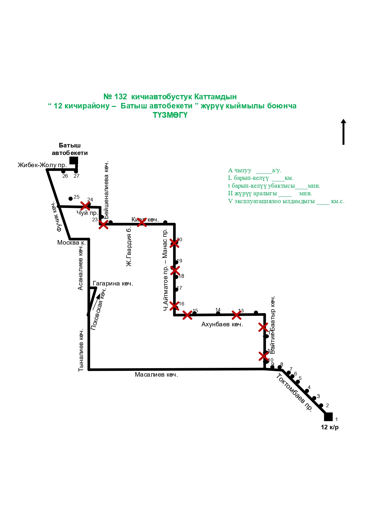 - № 132 — Западный автовокзал, проспект Жибек Жолу, улицы Фучика, Московская, Асаналиева, Тыналиева, Масалиева, Токомбаева, 12-й микрорайон;