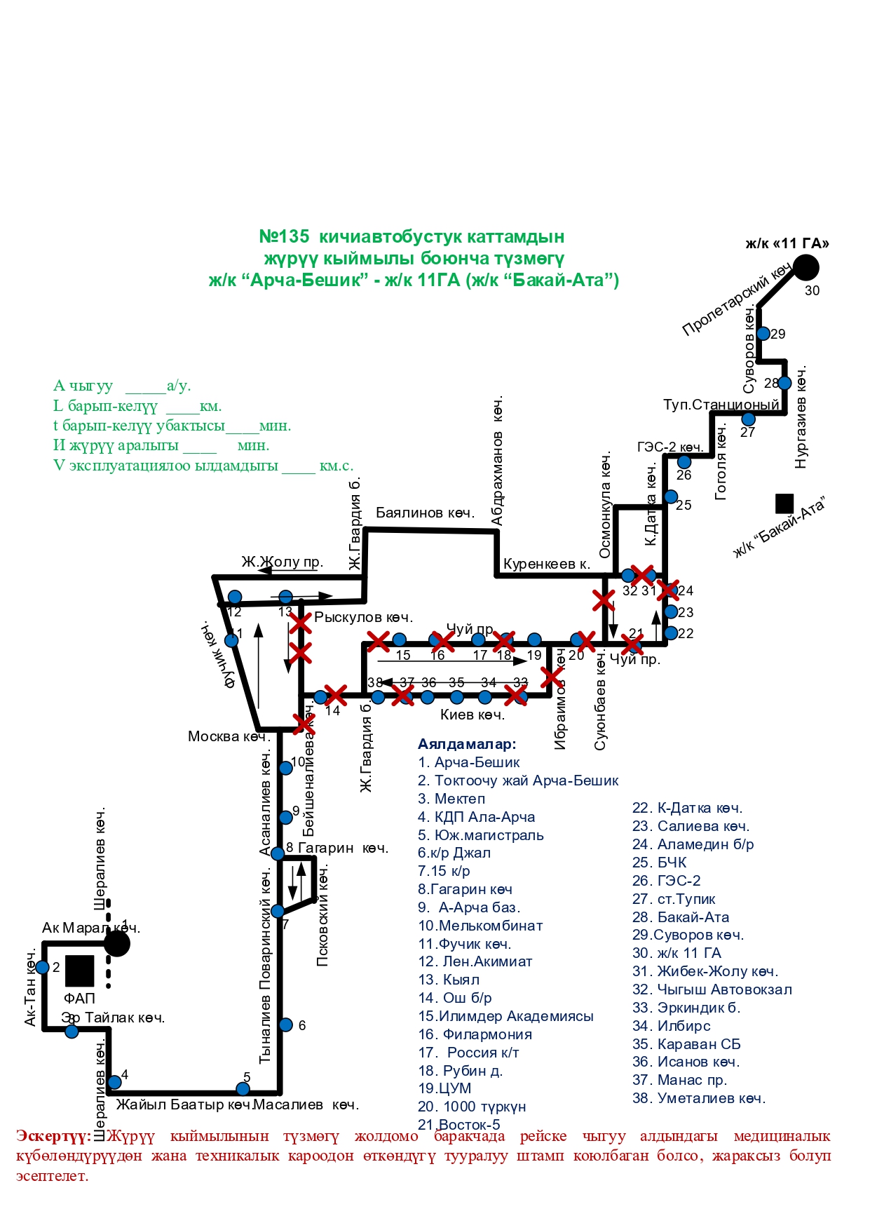 - № 135 — жилмассив «11 га» по схеме движения до улицы Осмонкула, улицы Куренкеева, Абдрахманова, Баялинова, бульвар Молодой Гвардии, проспект Жибек Жолу, улица Фучика, далее по схеме до улицы Ак-Марал;
