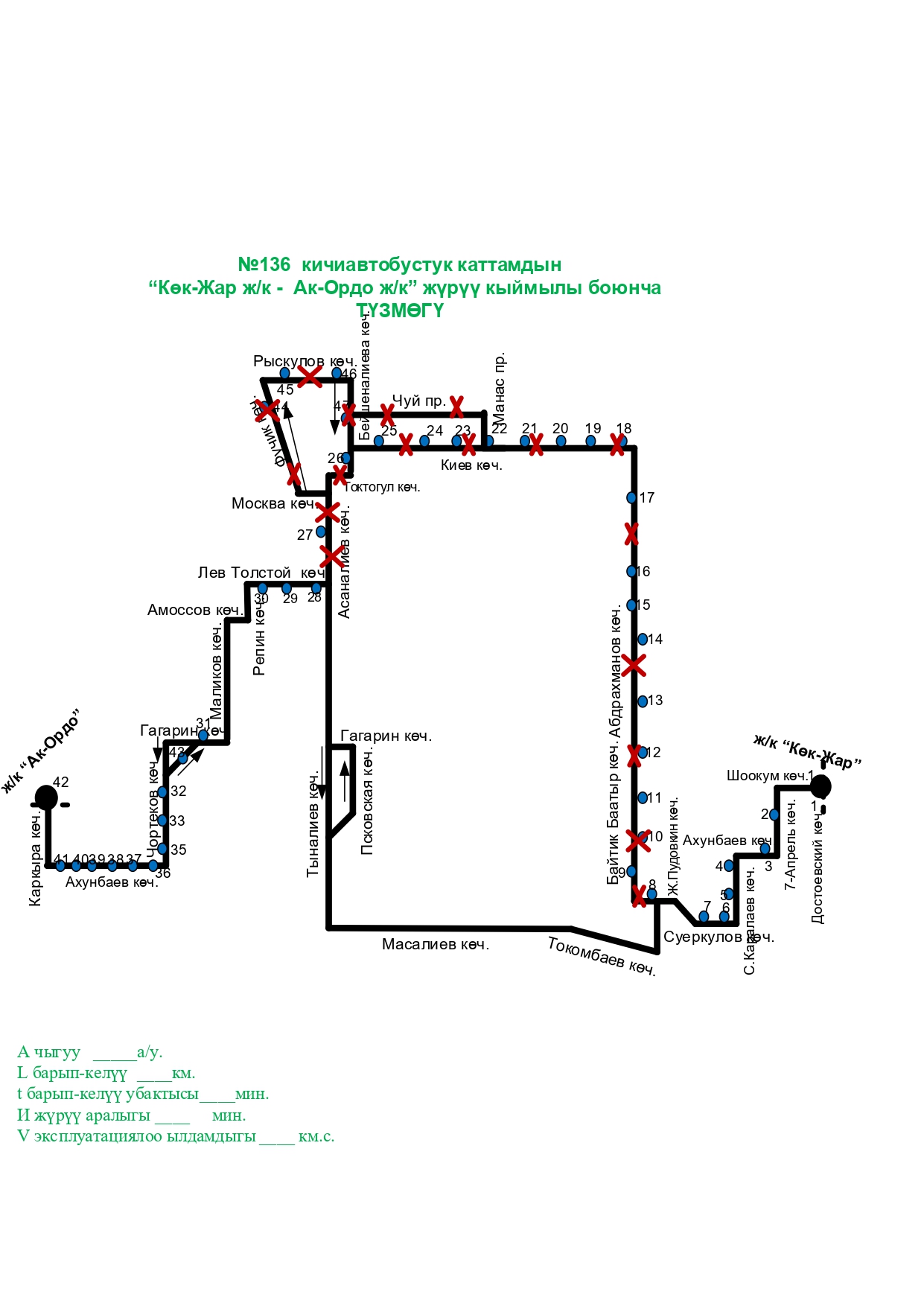 - № 136 — жилмассив «Ак-Ордо», далее по схеме движения до улицы Тыналиева, улицы Масалиева, Токомбаева, Суеркулова и далее по схеме до жилмассива «Кок-Жар»;