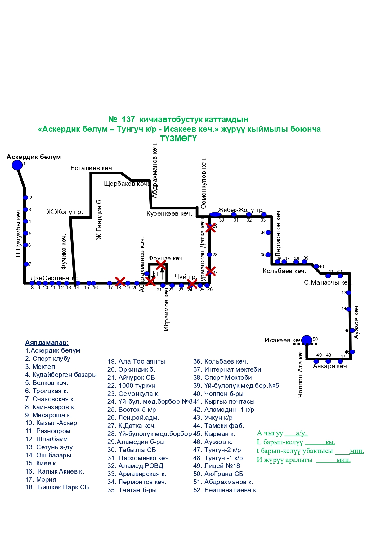 - № 137 — Военное училище по улице Лумумбы, проспект Дэн Сяопина, улица Фучика, проспект Жибек Жолу, бульвар Молодой Гвардии, улицы Боталиева, Щербакова, Куренкеева, проспект Жибек Жолу, улицы Лермонтова, Кольбаева и далее по схеме движения до улицы Исакеева;