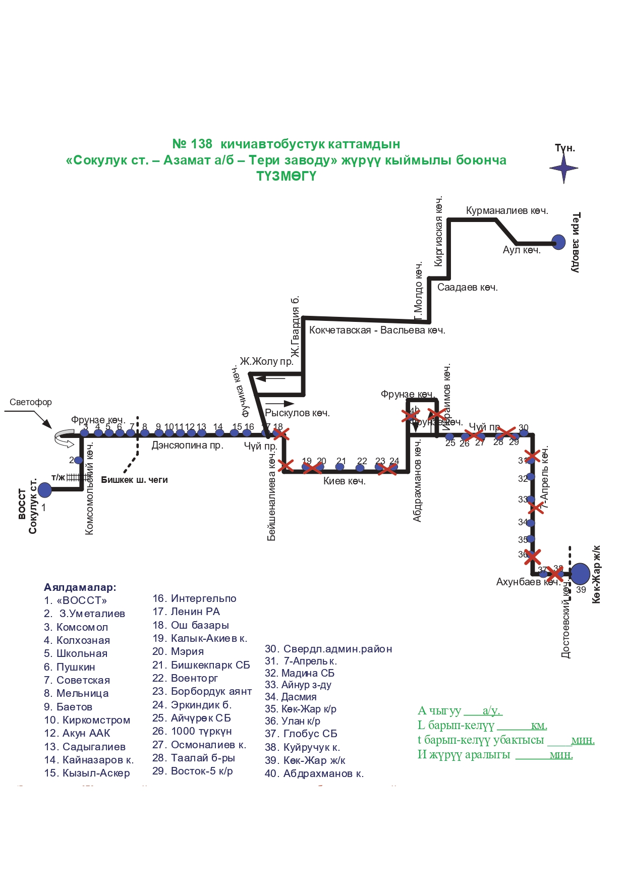 - № 138 — ВООСТ по схеме до улицы Фучика, улица Рыскулова, бульвар Молодой Гвардии, улицы Кокчетавская, Васильева, Тоголока Молдо, Саадаева, Киргизская, Курманалиева, Аул, Кожзавод;