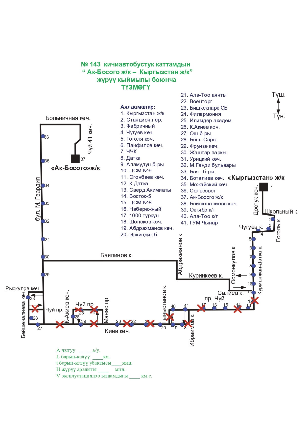 - № 143 — жилмассив «Ак-Босого», бульвар Молодой Гвардии, улицы Рыскулова, Бейшеналиевой, Киевская, бульвар Молодой Гвардии, улицы Баялинова, Абдрахманова, Куренкеева, Осмонкула, Салиевой и далее по схеме;