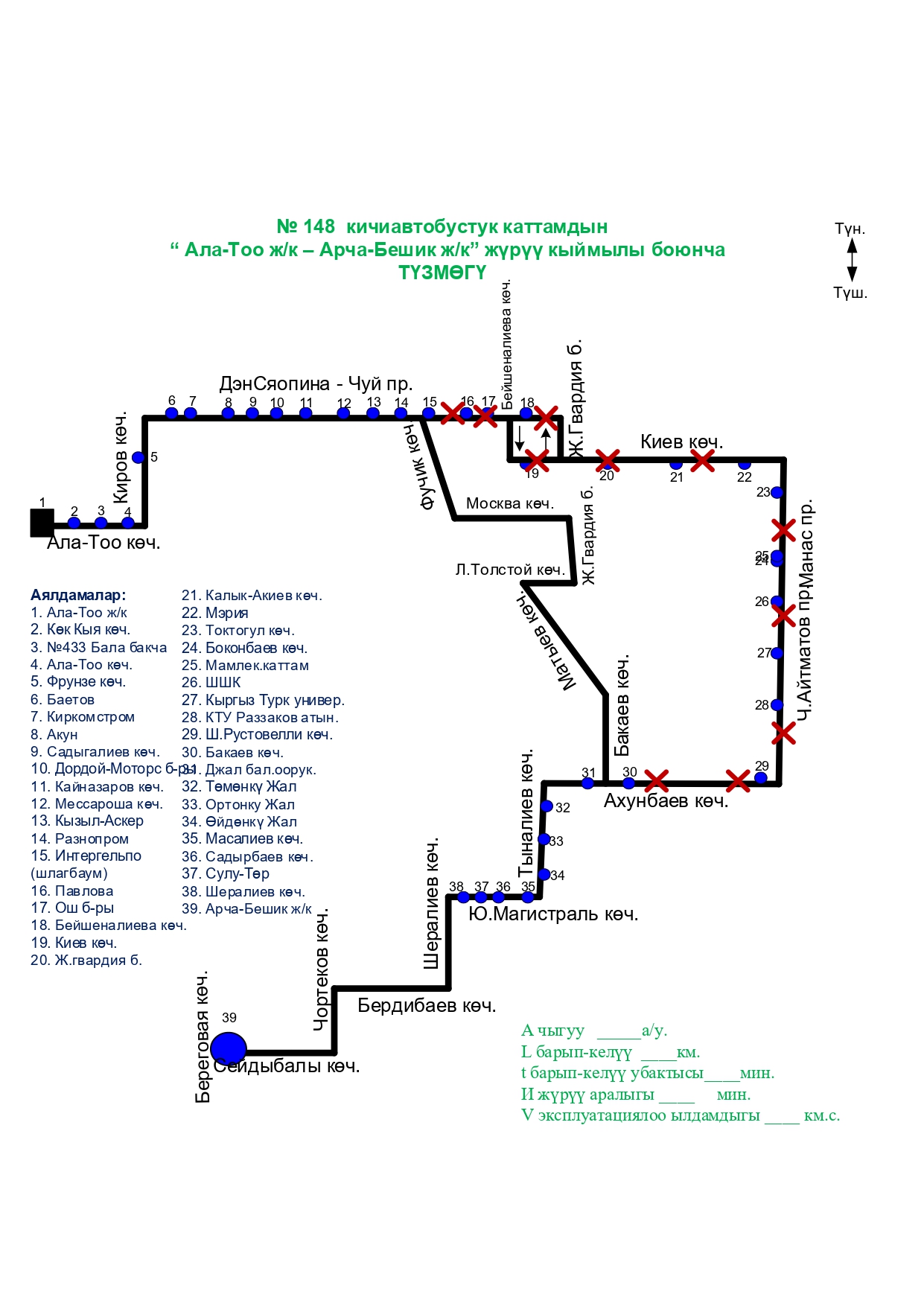 - № 148 — жилмассив «Ала-Тоо» по схеме до улицы Фучика, улицы Московская, Кулиева, Толстого, Бакаева, Ахунбаева и далее по схеме до улицы Береговой;
