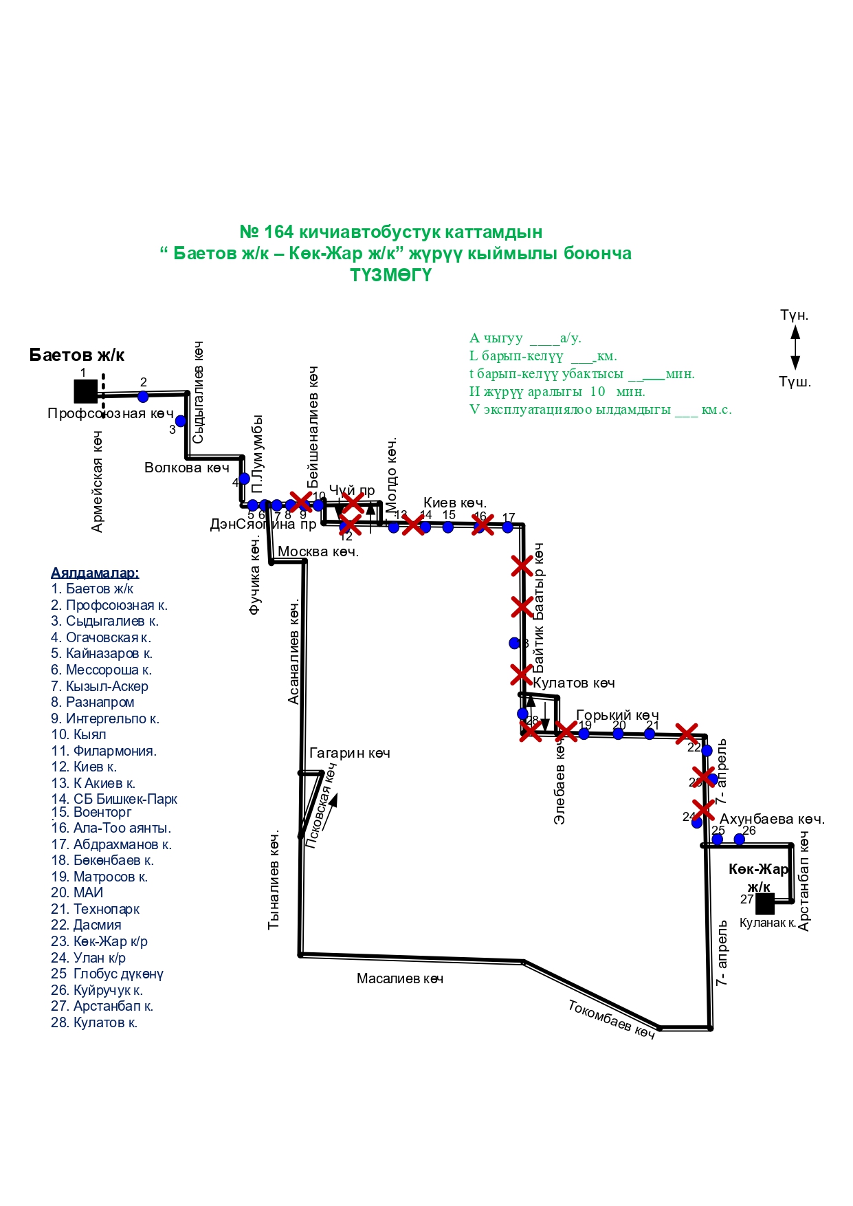- № 164 — жилмассив «Баетов» до улицы Фучика, улицы Московская, Асаналиева, Масалиева, 7 Апреля, Ахунбаева, Арстанбап, жилмассив «Кок-Жар»;