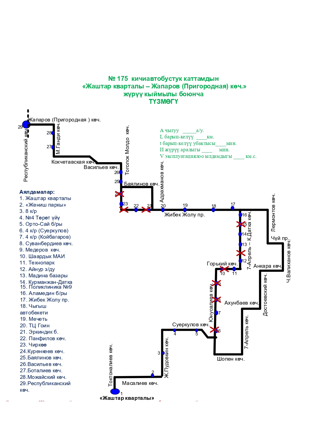 - № 175 — улица Капарова по схеме через улицу Баялинова, улица Абдрахманова, проспект Жибек Жолу, улица Лермонтова, проспект Чуй, улицы Валиханова, Анкара, Достоевского, Ахунбаева, 7 Апреля, Шопена, Суеркулова, далее по схеме до Жаштар кварталы;