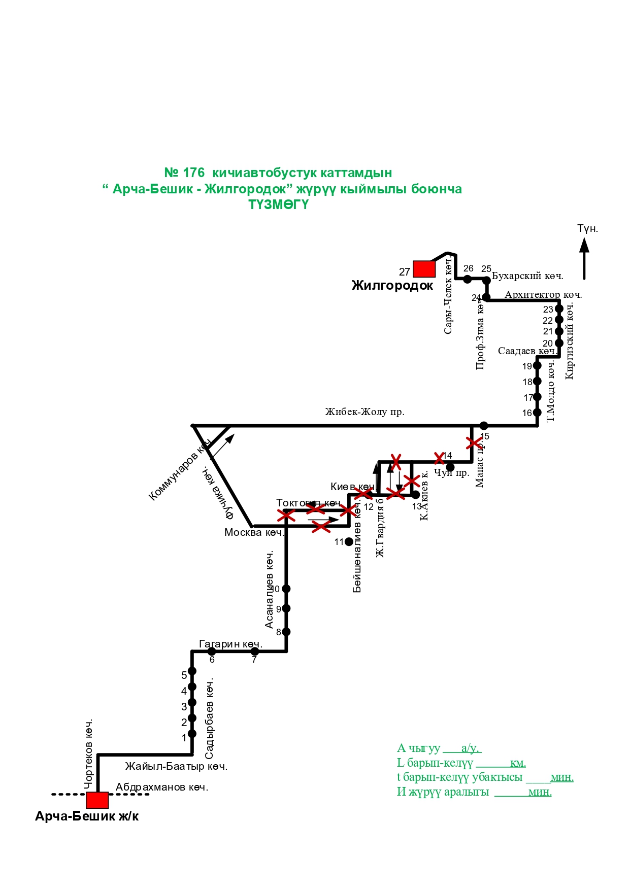 - № 176 — Жилгородок, по схеме до проспекта Жибек Жолу, улицы Фучика, Московская, Асаналиева, Гагарина, Садырбаева, Жайыла Баатыра, жилмассив «Арча-Бешик»;