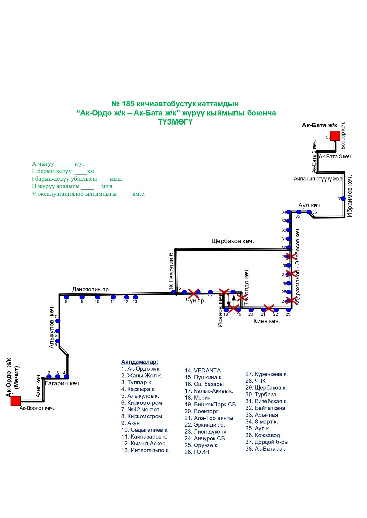 - № 185 — жилмассив «Ак-Ордо», по схеме до бульвара Молодой Гвардии, улицы Щербакова, Элебесова и далее по схеме до жилмассива «Ак-Бата»;