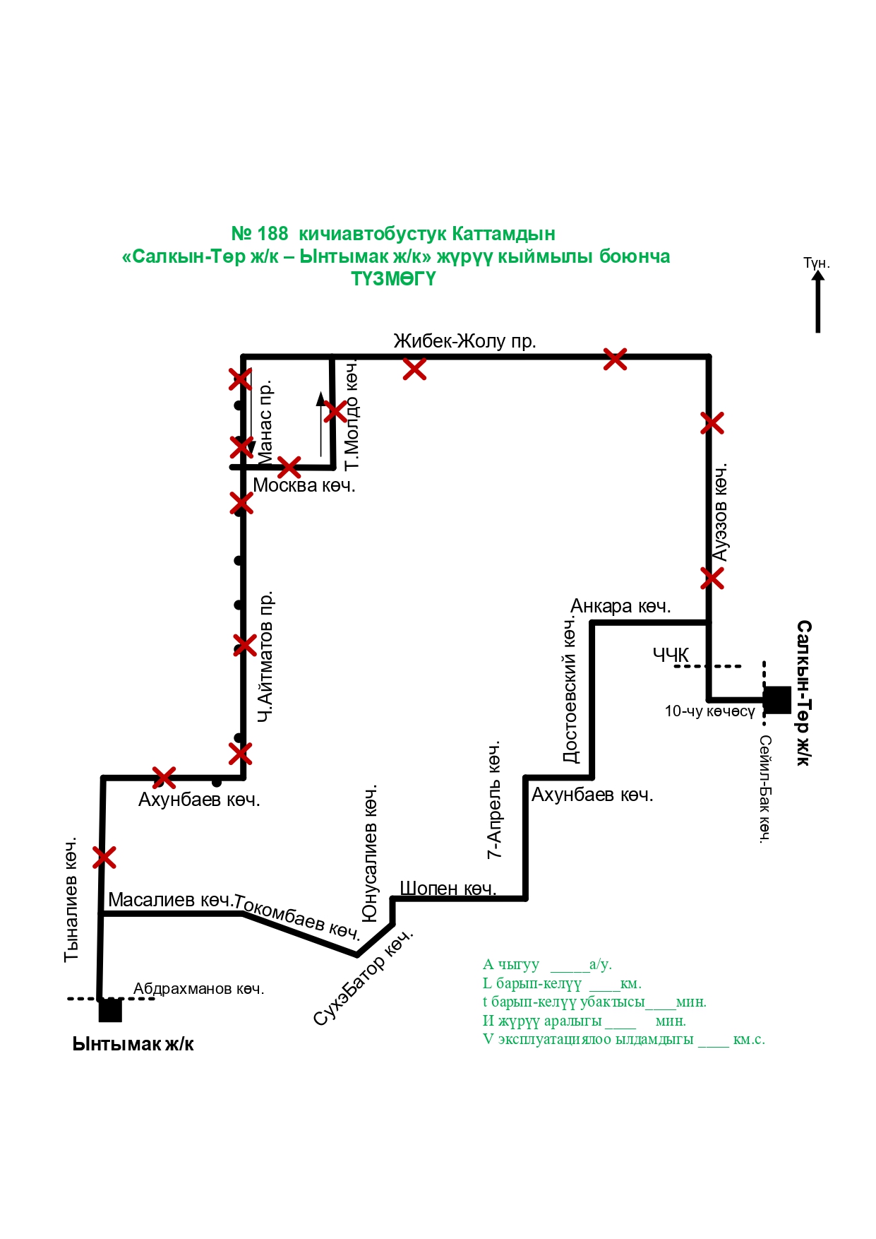 - № 188 — жилмассив «Ынтымак», улицы Масалиева, Токомбаева, Сухэ-Батора, Шопена, 7 Апреля, Ахунбаева, Достоевского, Анкара, Ауэзова, 10-я улица, жилмассив «Салкын -Тор»;