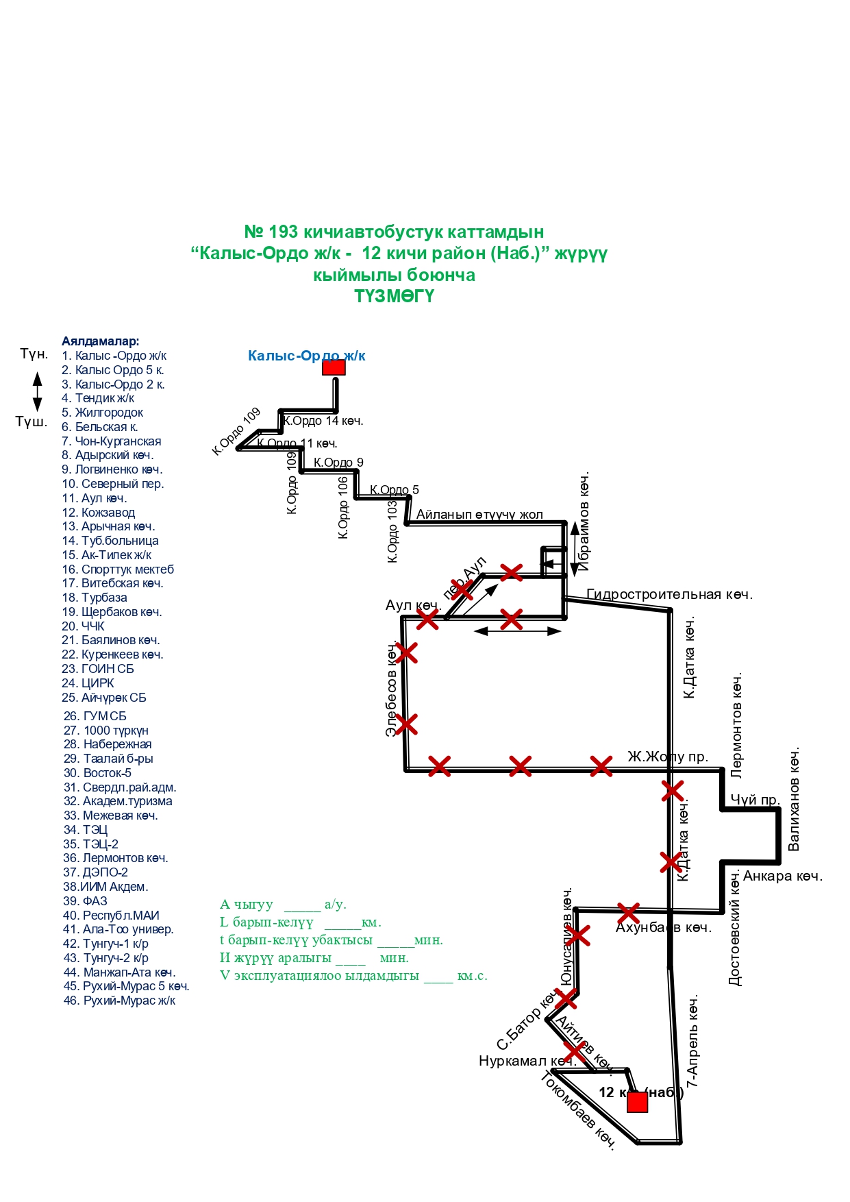 - № 193 — жилмассив «Калыс-Ордо» по схеме до улицы Ибраимова, улицы Гидростроительная, Курманджан Датки, проспект Жибек Жолу, улица Лермонтова, проспект Чуй, улицы Валиханова, Анкара, Достоевского, 7 Апреля, 12-й микрорайон;