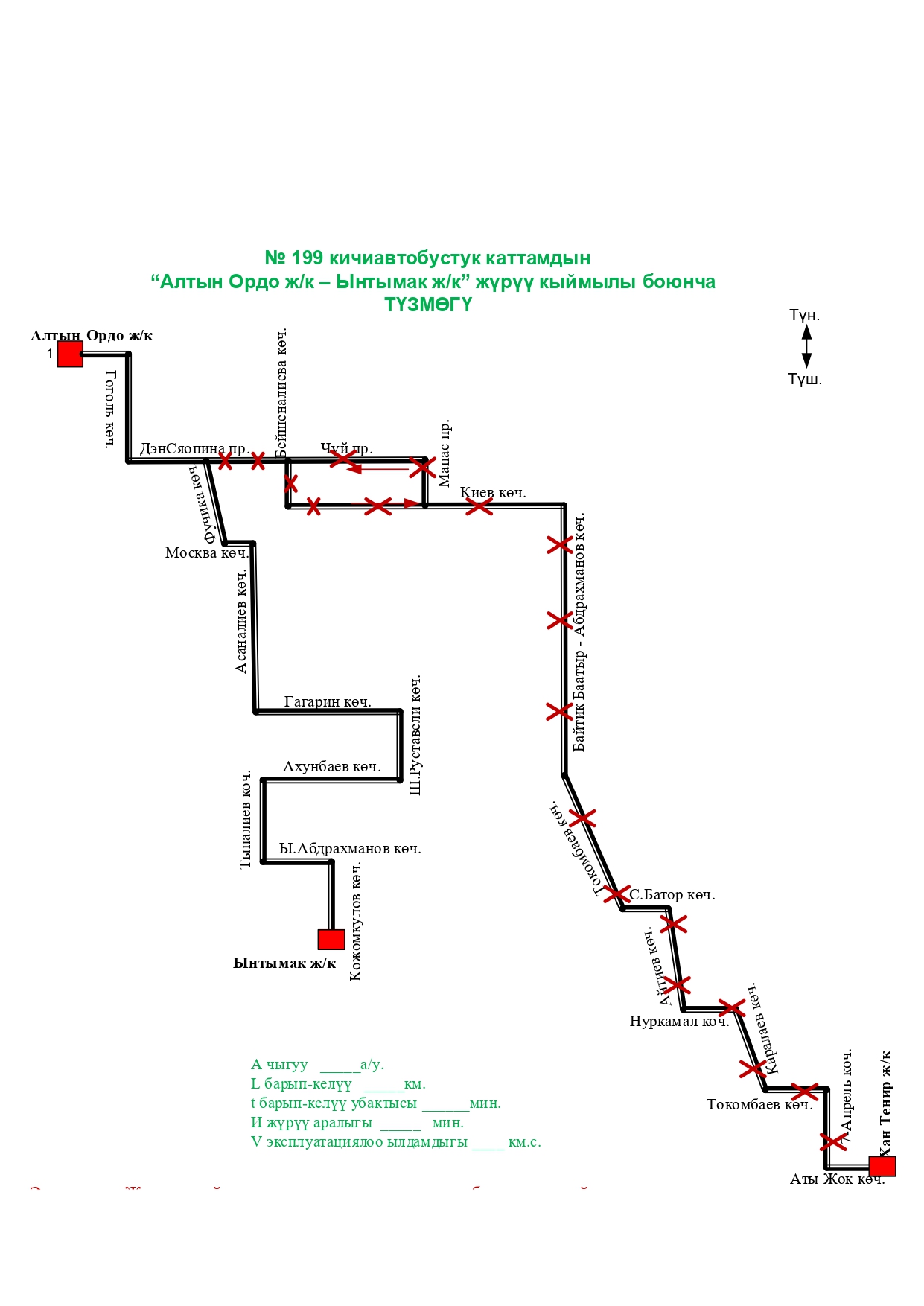 - № 199 — жилмассив «Алтын-Ордо», улица Гоголя, проспект Дэн Сяопина, улицы Фучика, Московская, Асаналиева, Гагарина, Кожомкулова, жилмассив «Ынтымак»;