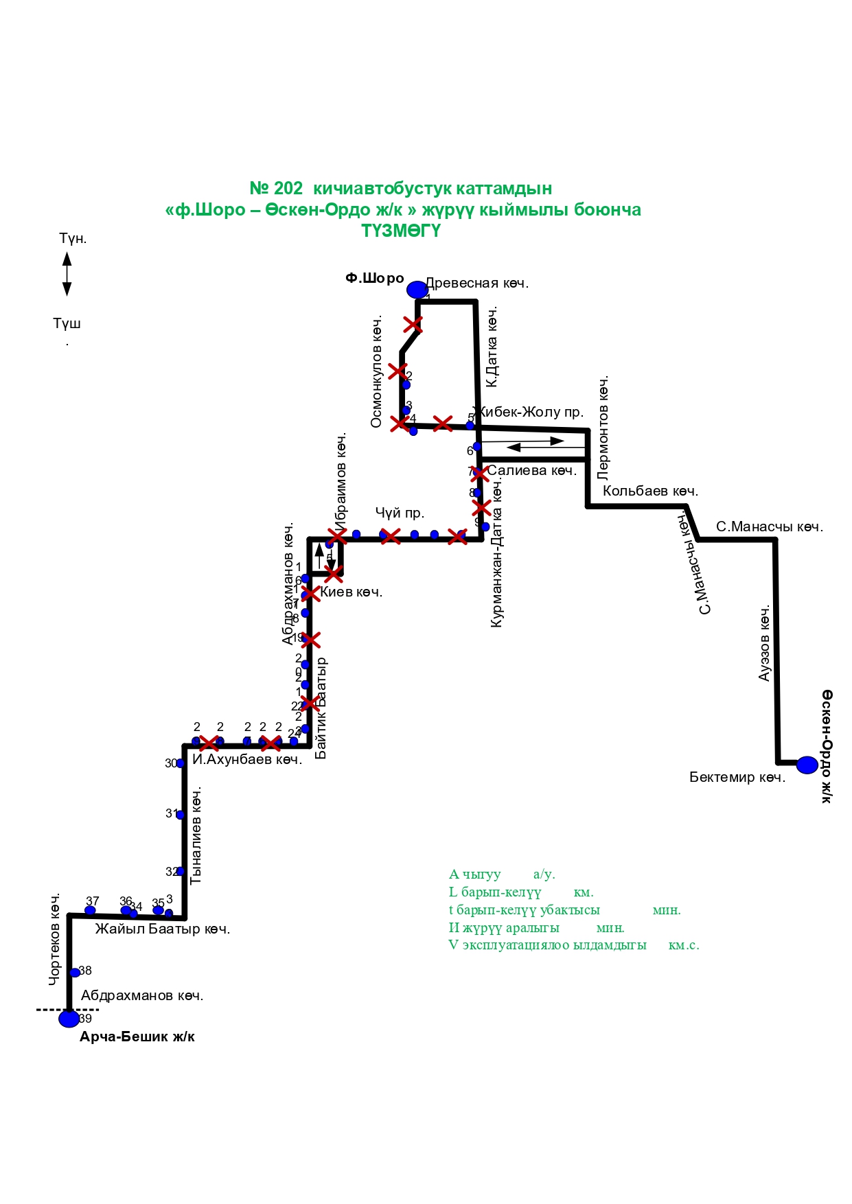 - № 202 — фирма «Шоро», улица Осмонкула, проспект Жибек Жолу, улицы Абдрахманова, Баялинова, бульвар Мододой Гвардии, проспект Жибек Жолу, улицы Фучика, Асаналиева, Тыналиева, Жайыла Баатыра, Чортекова, жилмассив «Арча-Бешик»;