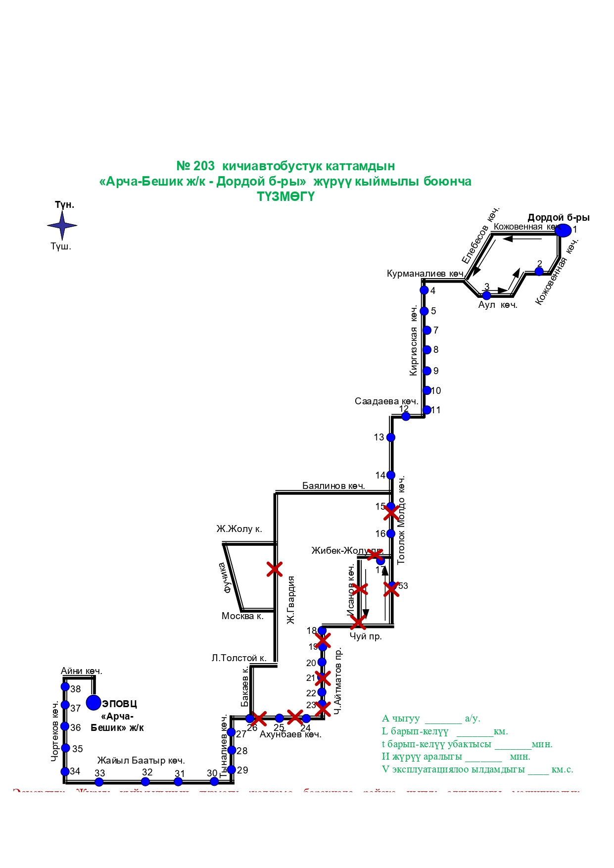 - № 203 — рынок «Дордой» по схеме до улицы Баялинова, проспект Жибек Жолу, улицы Фучика, Московская, бульвар Молодой Гвардии, улицы Толстого, Бакаева, Тыналиева, далее по схеме до ЭПОВЦ;