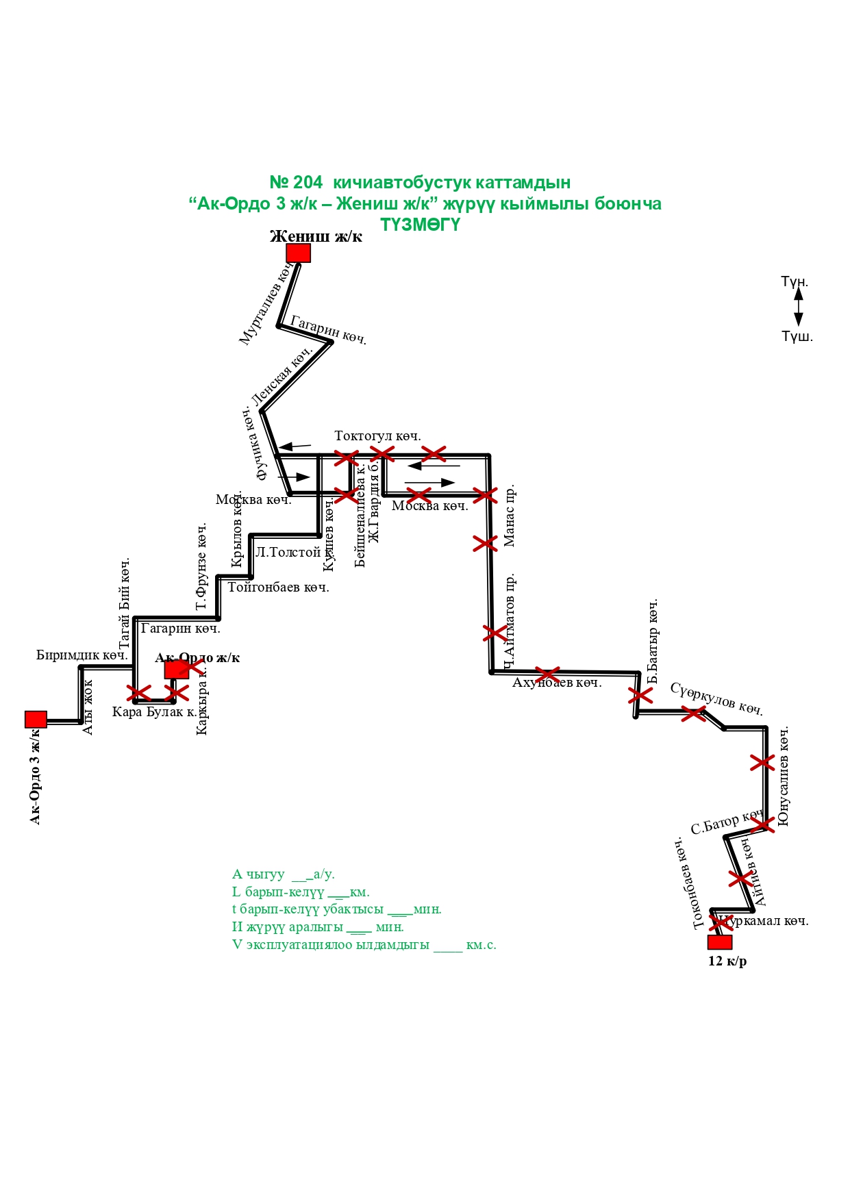 - № 204 — жилмассив «Ак-Ордо-3», улицы Биримдик, Тагай Бий, Гагарина, Тимура Фрунзе, Тойгонбаева, Крылова, Толстого, Кулиева, Фучика, Ленская, Гагарина, Мураталиева, жилмассив «Жениш»;