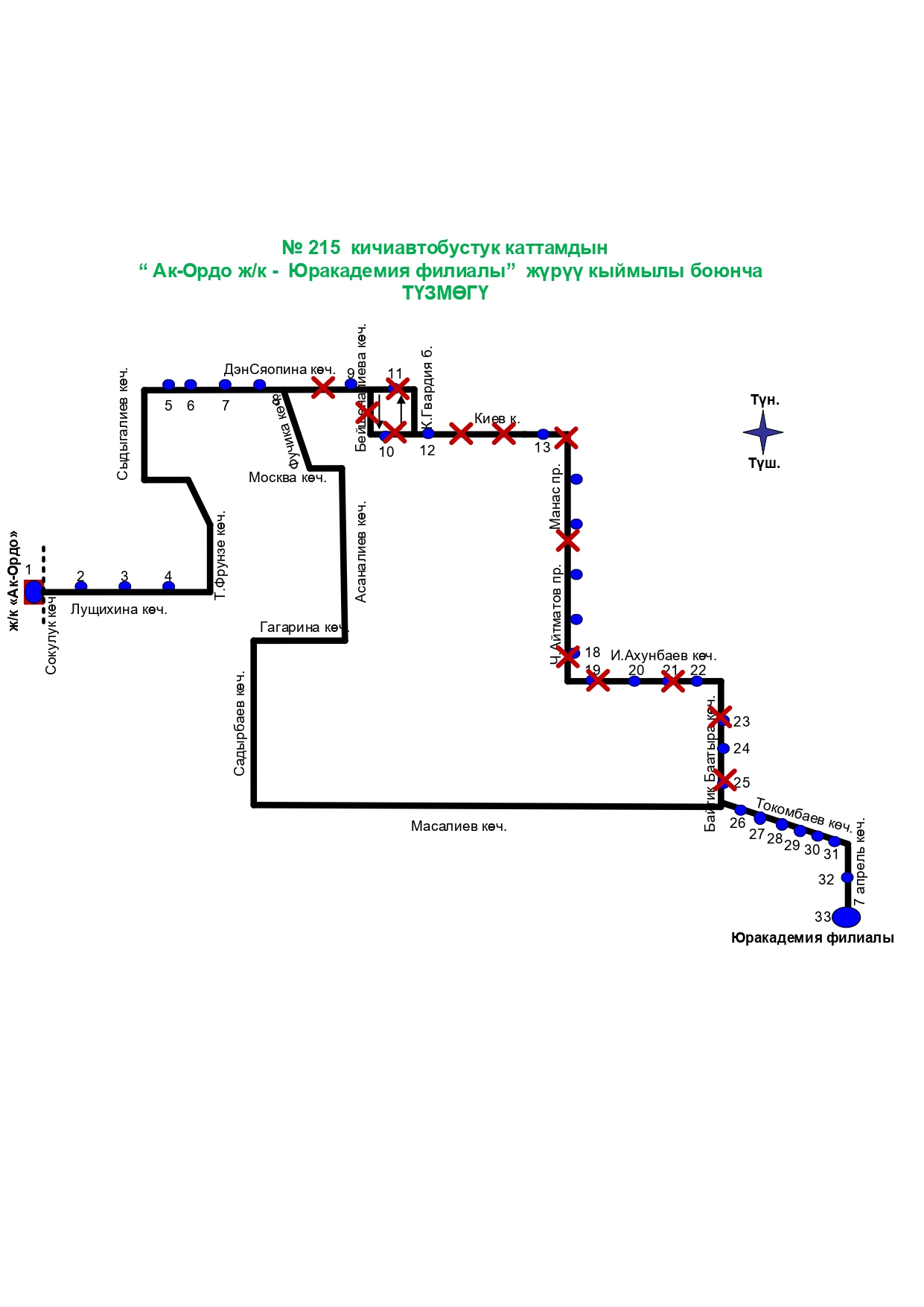 - № 215 — жилмассив «Ак-Ордо» до улицы Фучика, улицы Московская, Асаналиева, Гагарина, Садырбаева, Масалиева, Токомбаева, 7 Апреля, до филиала Юридической академии;