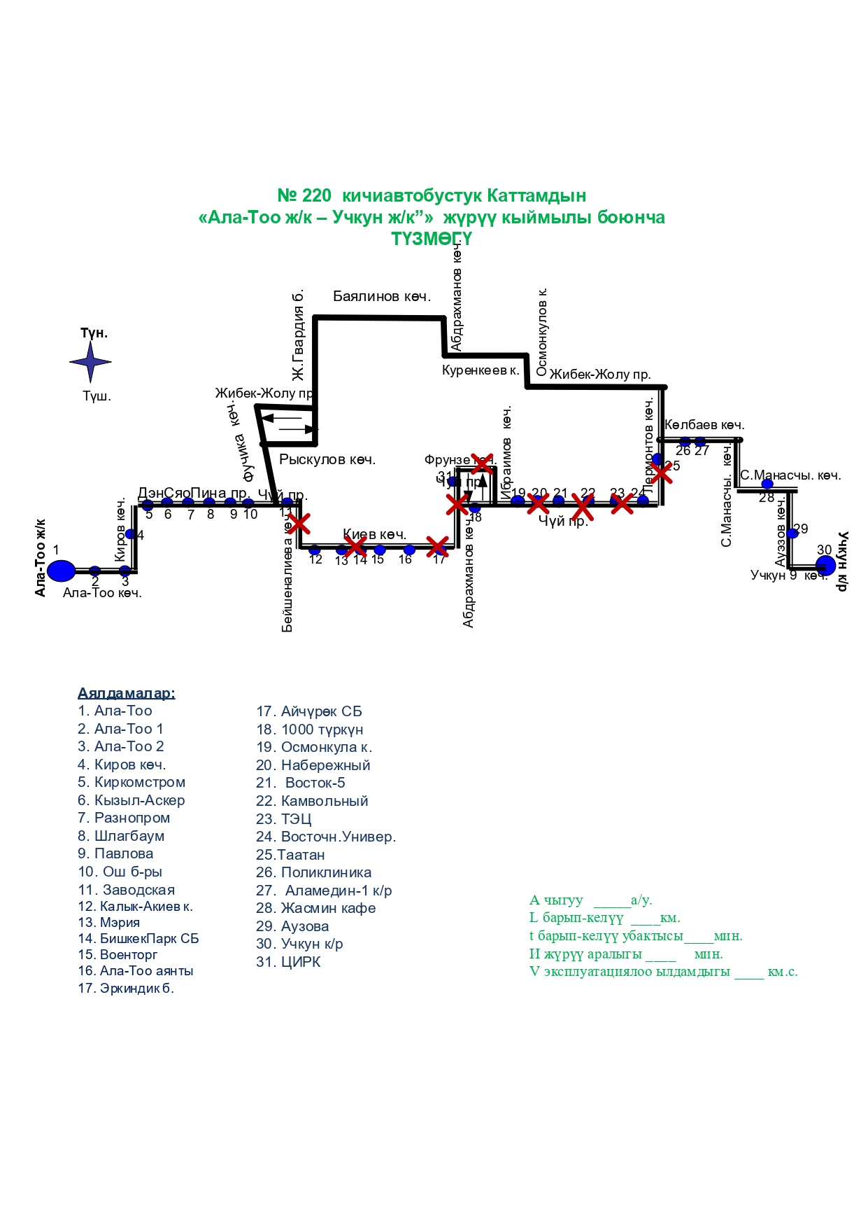 - № 220 — жилмассив «Ала-Тоо» по схеме до улицы Фучика, проспект Жибек Жолу, бульвар Молодой Гвардии, улицы Баялинова, Абдрахманова, Куренкеева, Осмонкула, проспект Жибек Жолу, улицы Лермонтова, Кольбаева, Манасчи Сагынбая, Ауэзова, жилмассив «Учкун»;