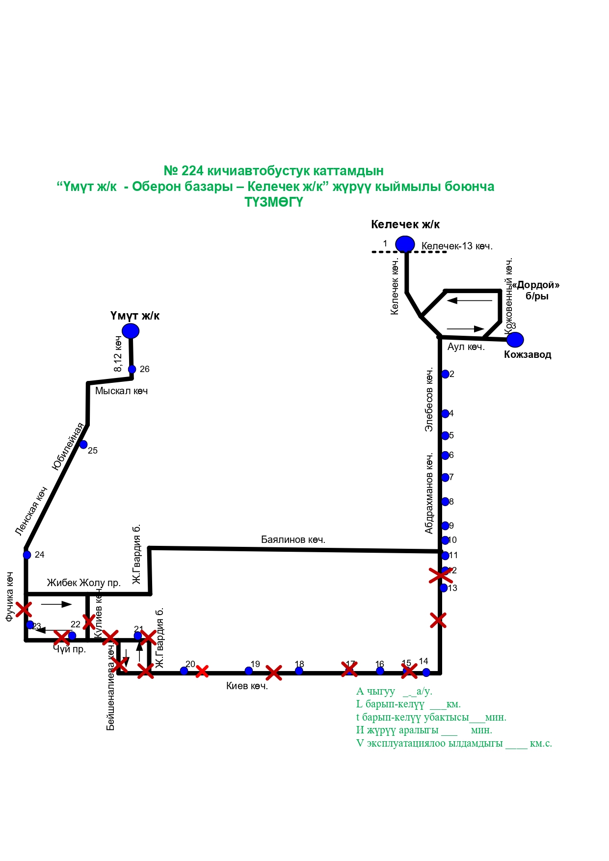 - № 224 — жилмассив «Келечек» по схеме до улицы Баялинова, бульвар Молодой Гвардии, проспект Жибек Жолу, улицы Фучика, Ленская, по схеме до жилмассива «Умут»;