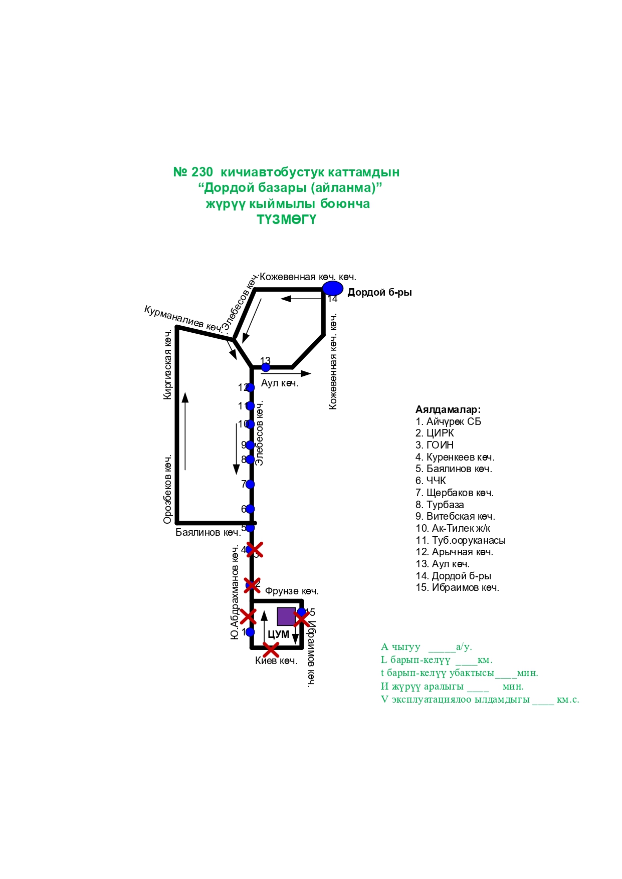 - № 230 — рынок «Дордой» по схеме до улицы Баялинова;