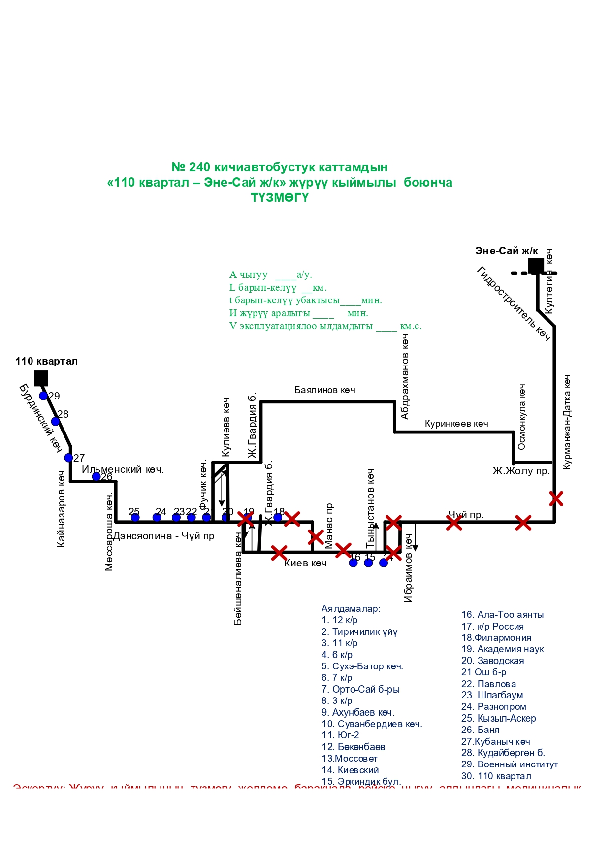 - № 240 — 110-й квартал по схеме, улица Фучика, бульвар Молодой Гвардии, улицы Баялинова, Абдрахманова, Куренкеева, Осмонкула, проспект Жибек Жолу и далее по схеме до жилмассива «Эне-Сай»;