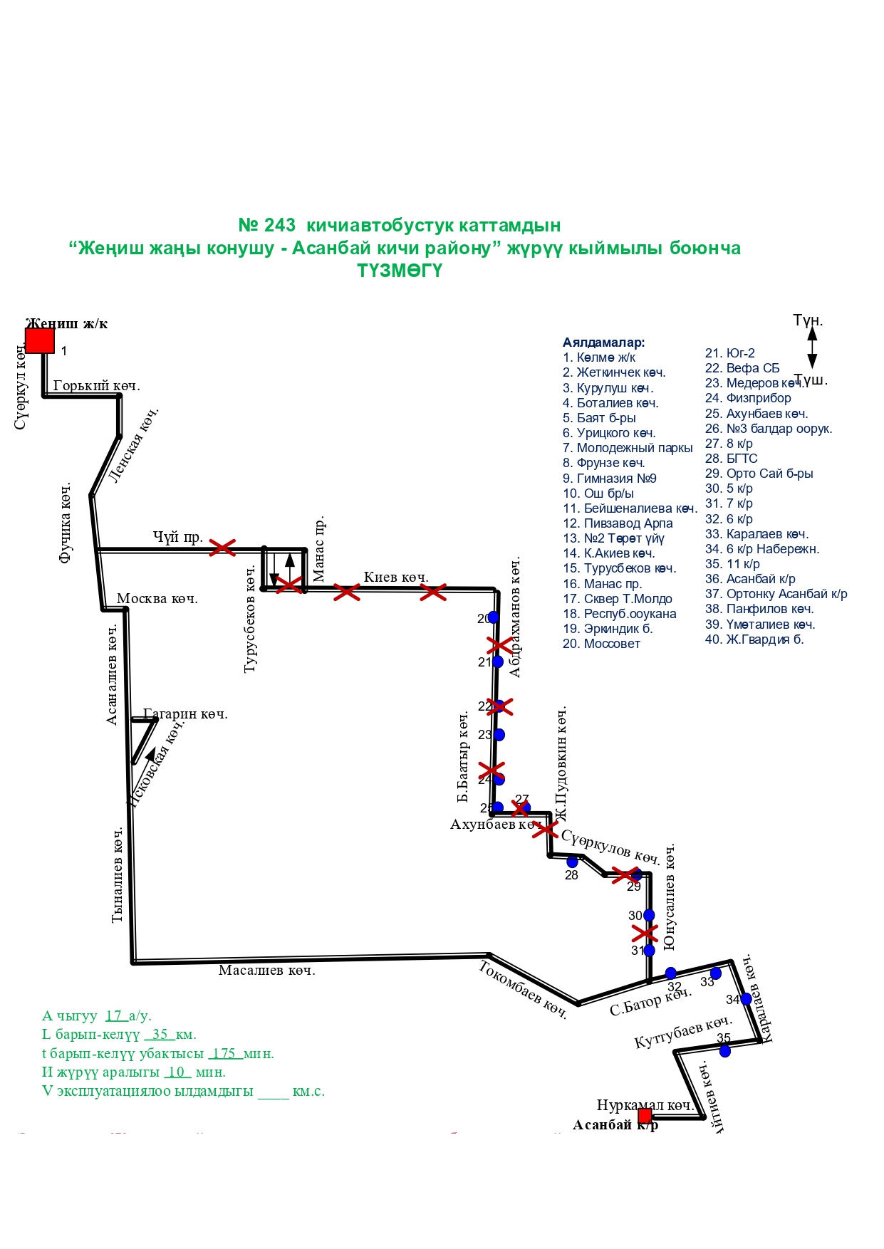 - № 243 — жилмассив «Жениш», улицы Горького, Ленская, Фучика, Асаналиева, Тыналиева, Масалиева, Токомбаева, Сухэ-Батора, далее по схеме до микрорайона «Асанбай»;