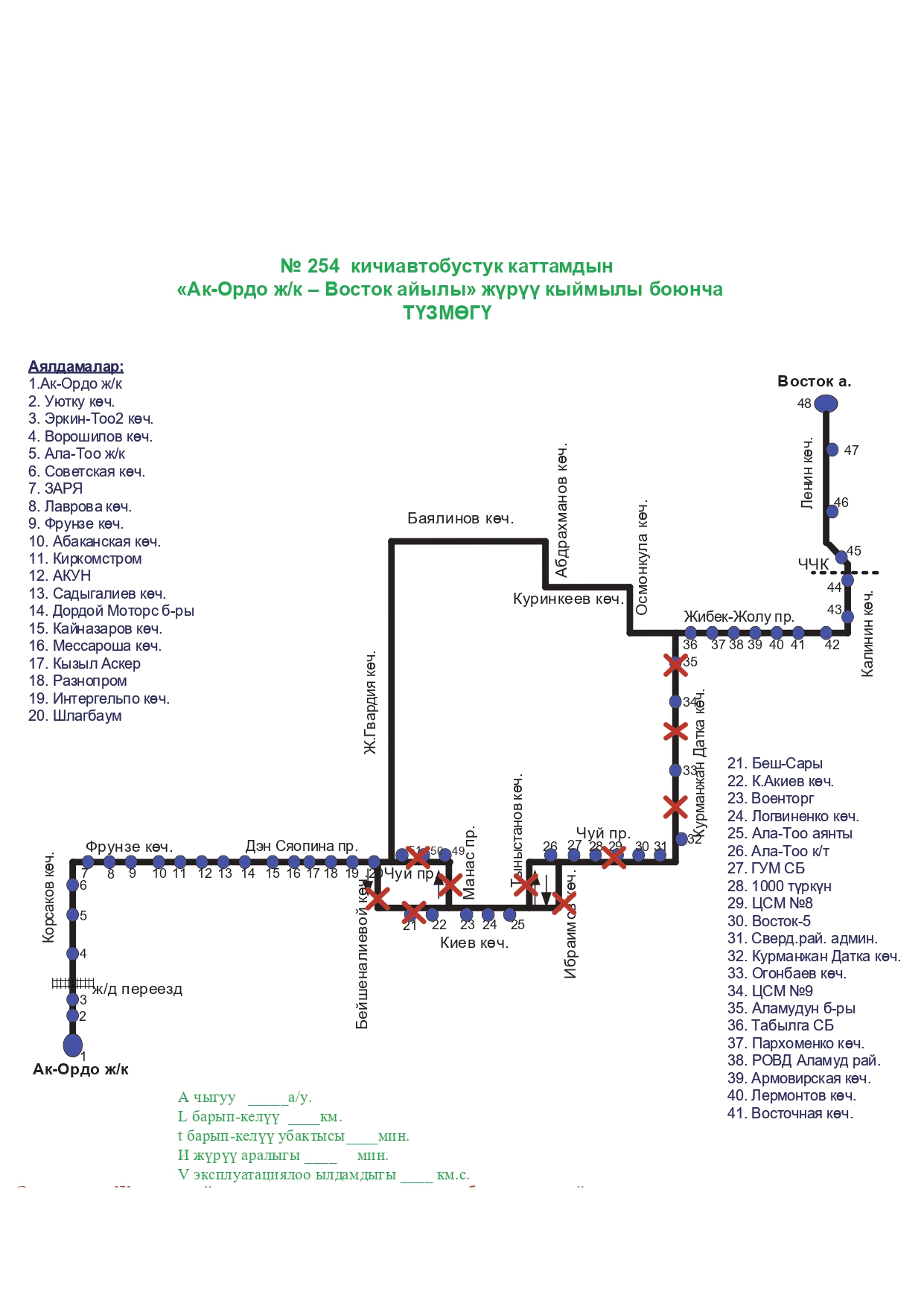 - № 254 — жилмассив «Ак-Ордо» до бульвара Молодой Гвардии, улицы Баялинова, Абдрахманова, Куренкеева, Осмонкула, проспект Жибек Жолу и далее по схеме до жилмассива «Восток»;