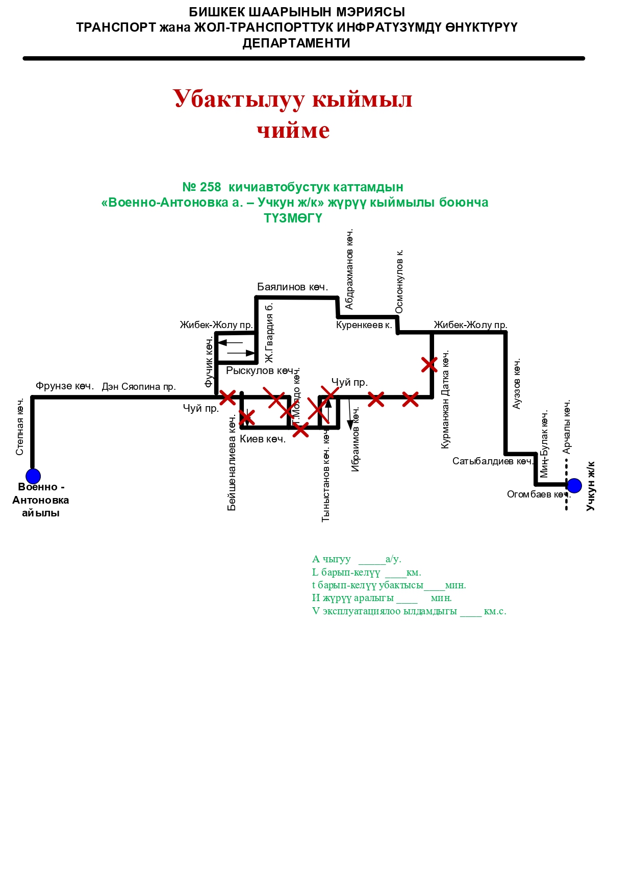 - № 258 — село Военно-Антоновка до улицы Фучика, проспект Жибек Жолу, улицы Баялинова, Куренкеева, проспект Жибек Жолу, улицы Ауэзова, Сатыбалдиева и далее по схеме до жилмассива «Учкун»;