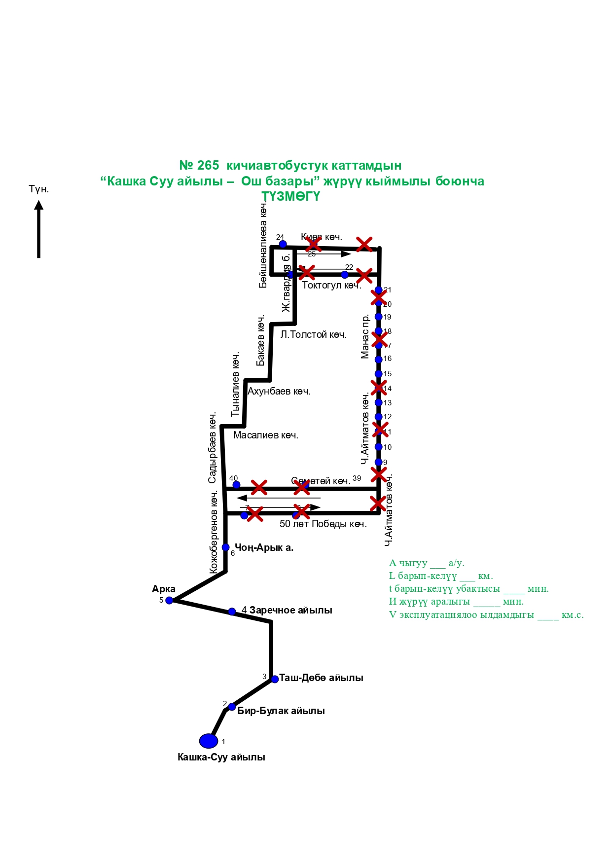 - № 265 — из села Кашка-Суу до улицы Кожобергенова, улицы Садырбаева, Толстого, бульвар Молодой Гвардии, улицы Токтогула, Бейшеналиевой, Киевская;
