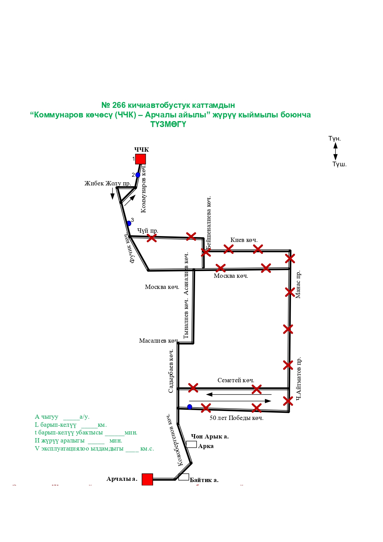 - № 266 — улица Коммунаров, проспект Жибек Жолу, улицы Фучика, Тыналиева, Садырбаева, Кожобергенова, село Арчалы.
