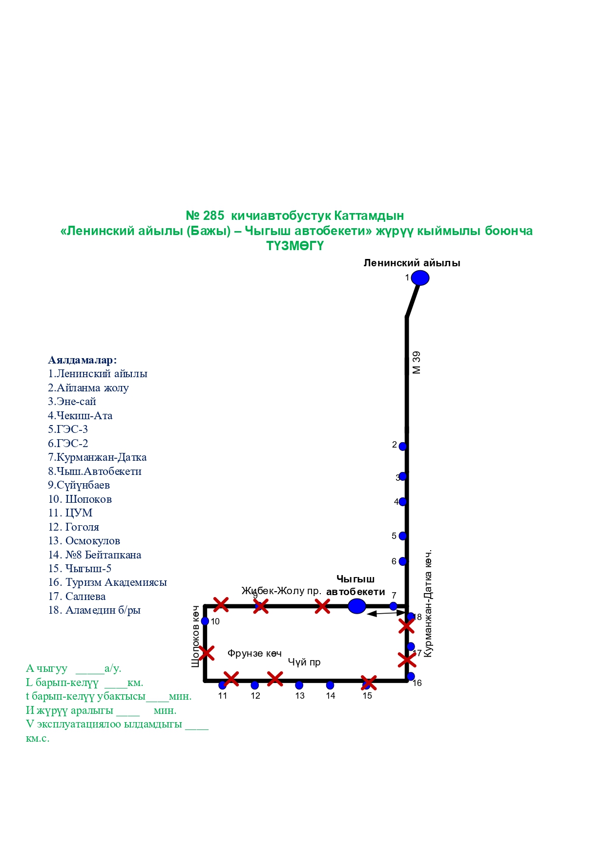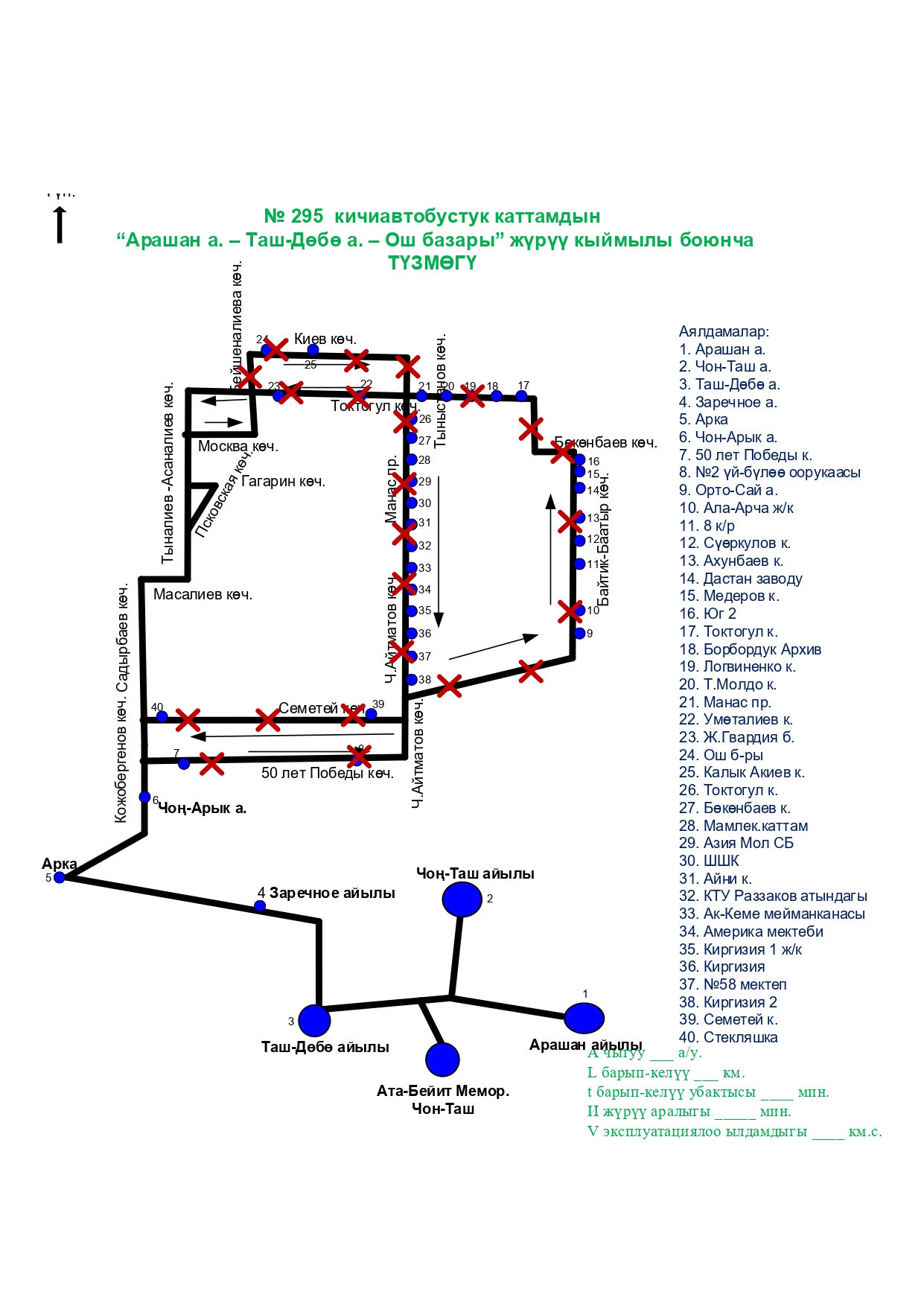 - № 295 — село Арашан по схеме до улицы Кожобергенова, улицы Садырбаева, Тыналиева.