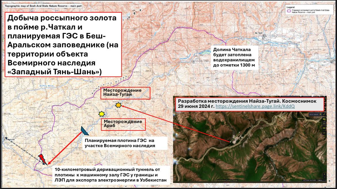 «Разрабатываемые месторождения также могут оказаться в зоне затопления водохранилища новой ГЭС на реке Чаткал. Именно под этот проект на территории Беш-Аральского заповедника власти КР сейчас активно ищут инвесторов. На недавно состоявшемся при поддержке Всемирного банка инвестиционном форуме в Вене (Австрия) представлен обновленный проект Чаткальской ГЭС, который включает в себя создание водохранилища объемом 860 миллионов кубометров, строительство 10-километрового деривационного туннеля от плотины до машинного зала ГЭС, а также прокладку линии электропередачи для экспорта вырабатываемой электроэнергии в соседний Узбекистан», — добавили в коалиции.