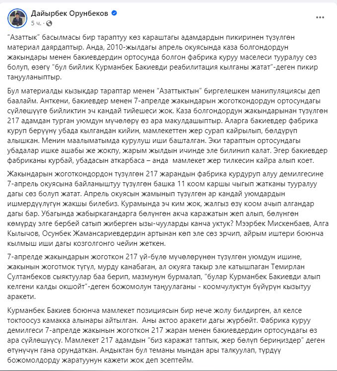 «Власти не раз заявляли, что если Курманбек Бакиев прилетит в Кыргызстан, то сразу будет арестован. Нет попыток его реабилитации. Строительство фабрики — это личные переговоры Бакиева и 217 граждан, которые потеряли своих близких во время апрельской революции. Государство лишь исполнило просьбу апрелевцев, которые сказали, что «нашли средства, выделите землю», — написал Дайырбек Орунбеков.