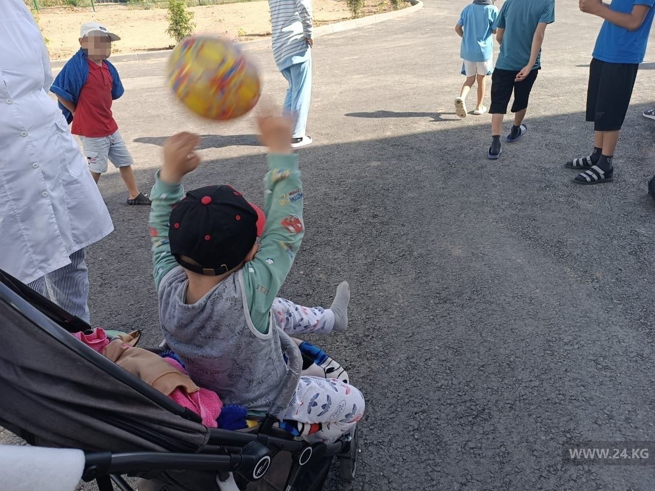 Трехлетний ребенок, сидя в коляске, весело подкидывает мяч. Мальчишка готов ходить сам, но торопиться нельзя, говорят врачи. Буквально недавно он сделал первый шаг после операции. По словам женщины, ее сын хорошо развивался, пока однажды не начались проблемы со здоровьем. Ходили по врачам, обследовались, поставили диагноз «туберкулез костей». Пять месяцев ребенок пролежал в Национальном центре фтизиатрии, после отправили на реабилитацию на побережье Иссык-Куля.В этом центре они больше месяца и пробудут до сентября. Мама и доктора отмечают прогресс: мальчик стал спокойнее, у него улучшились настроение, сон и аппетит, заметна прибавка в весе.