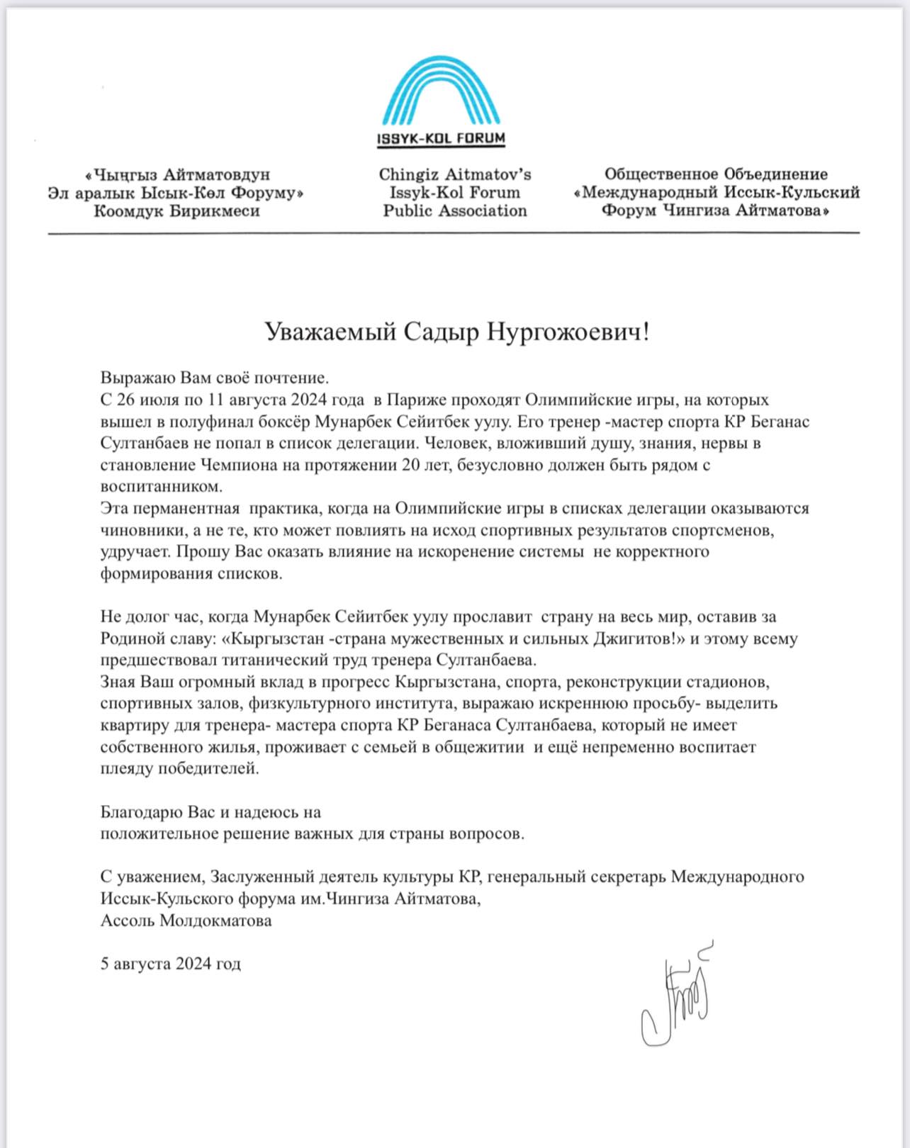 Заслуженный деятель культуры КР Ассоль Молдокматова обратилась к президенту Садыру Жапарову с просьбой выделить квартиру тренеру боксера Мунарбека Сейитбек уулу Беганасу Султанбаеву.