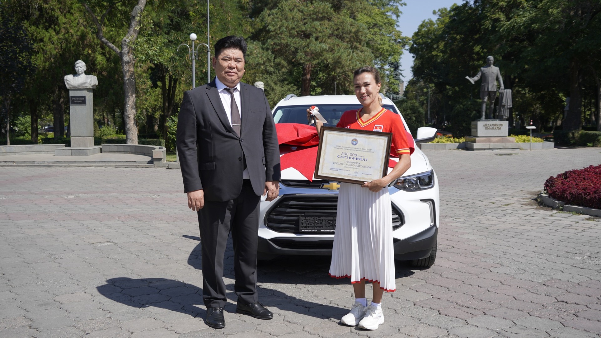 Легкоатлетка получила сертификат на 500 тысяч сомов и ключи от автомобиля Chevrolet Tracker.