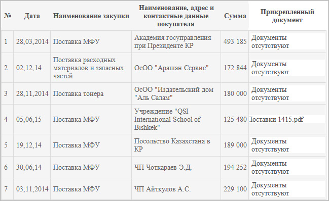 А именно,в разделе «Сведения о наличии опыта аналогичных поставок», где указано, что опыт поставок за последние два года (2013-2014) должен составлять не менее 20 миллионов сомов. «У данного поставщика, по представленным сведениям о квалификации, он (опыт поставок. - Прим. ИА «24.kg») составлял только 3 миллиона 794 тысячи 400 сомов, участник был отклонен», - говорится в официальном письме ГУПМ МВД. Странно, а в протоколе вскрытия, опубликованном на портале госзакупок, комиссию устроило все.