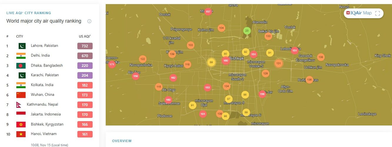 В рейтинге крупнейших городов мира по качеству воздуха World Air Quality Бишкек находится на 9-м месте.