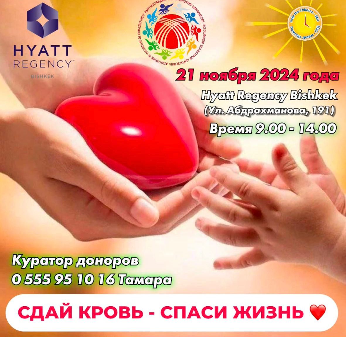 Союз волонтеров Кыргызстана, благотворительный фонд Help the Children и отель Hyatt Regency Bishkek ждут неравнодушных, желающих участвовать в спасении жизни больных детей.