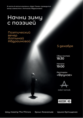 Стихи Алтынай Абдраимовой прозвучат под аккорды пианистки Ирины Артющенко. Атмосферу вечера дополнит народный артист Кыргызской Республики Эрнис Асаналиев. Специальный гость — Аман Эсенбеков.
