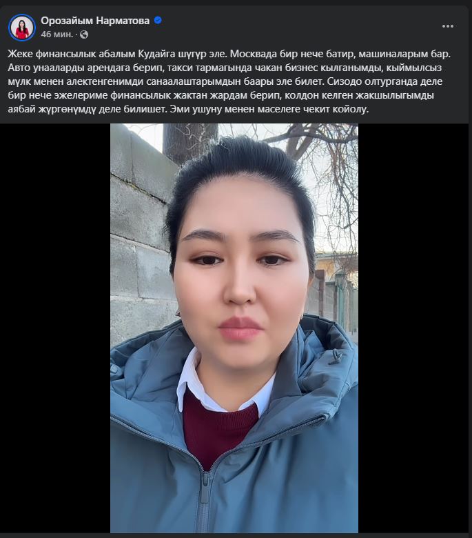 «В 2021 году работала с ними во время предвыборной агитации партии «Бутун Кыргызстан». После этого предлагали мне сотрудничать с ними в качестве партнера. Друзья на Facebook, наверное, заметили, что я выставила на продажу квартиру в Москве. Осенью продала ее и стала владеть половиной холдинга «Сереп медиа». На сегодня мы с Бактыгуль Сокушовой являемся полноправными учредителями», — написала Орозайым Нарматова.