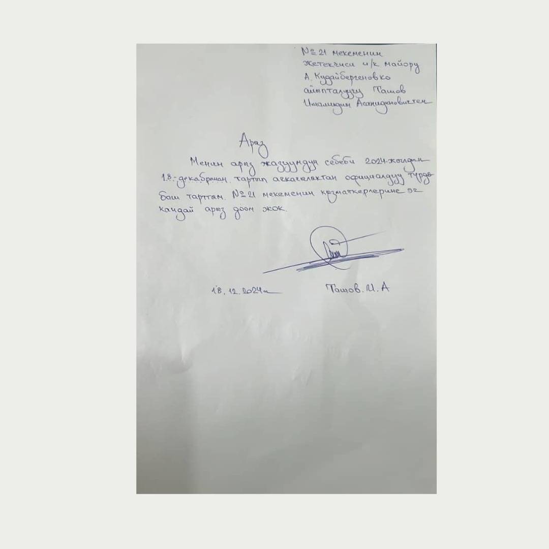 Имамидин Ташов в присутствии Бакытбека Касымкулова написал заявление о прекращении голодовки.