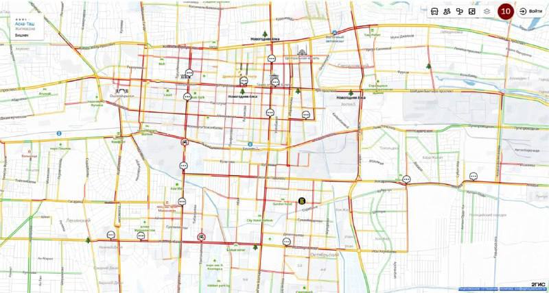 По данным портала 2GIS, центр города практически встал. Зафиксирован максимальный балл дорожных заторов — 10.