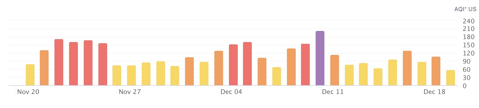 Индекс качества воздуха (AQI) разделен на шесть категорий, указывающих на возрастающий уровень опасности для здоровья. Значение AQI выше 300 — это опасное качество воздуха, а значение ниже 50 — хорошее.