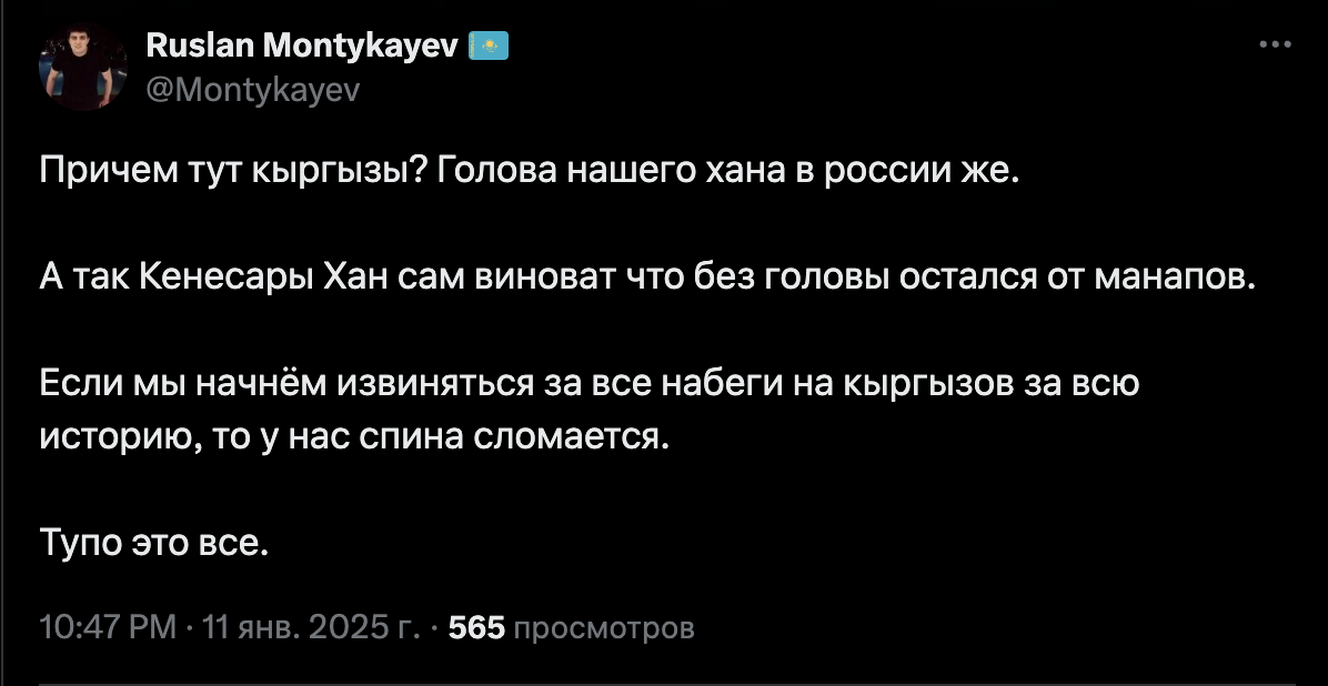 На инцидент обратил внимание доктор исторических наук Кыргызстана Оскон Осмонов. Он рекомендовал молодежи изучать историю и рассказал, как произошла битва между двумя ханами.