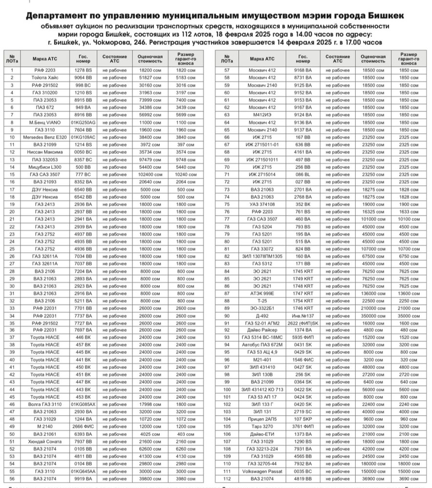 В Бишкеке на аукцион выставили 112 старых машин мэрии города. Уточняется, что аукцион объявил департамент по управлению муниципальным имуществом для реализации транспортных средств, находящихся в муниципальной собственности.
