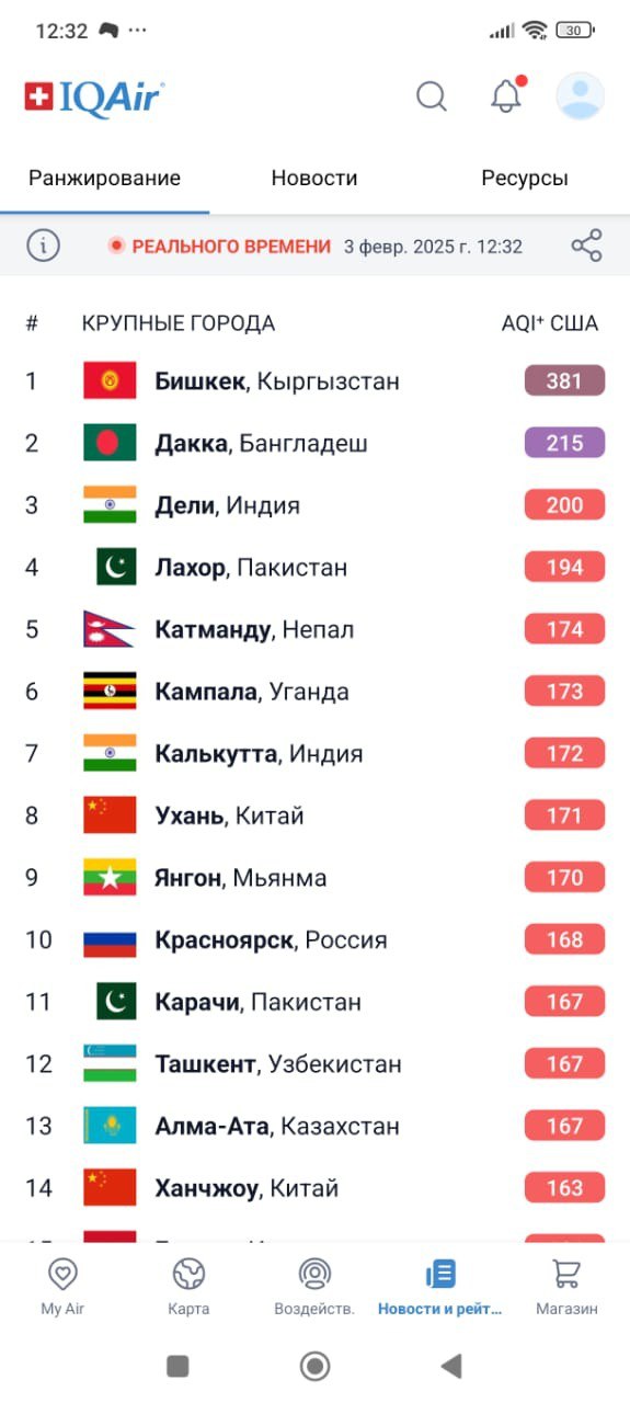 В рейтинге крупнейших городов мира по качеству воздуха World Air Quality на 18.00 Бишкек находится на первом месте.
